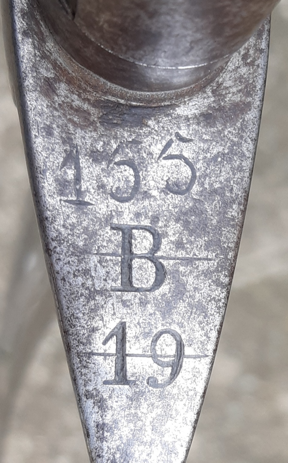 Auffällig ist, dass die 155 graviert und nicht gestempelt zu sein scheint und von den anderen Zeichen abweicht. Evtl. kam die 155 ja auch erst später hinzu und hat mit der B 19 ursprünglich gar nichts zu tun. Hierfür würde auch die unterschiedliche Positionierung auf Waffe und Scheide sprechen: Auf der Waffe war eben gar kein Platz mehr, um die 155 unter B 19 zu stempeln. Evtl. ersetzt die 155 die B 19, die dann bei Außerdienststellung des Regiments gelöscht wurde.