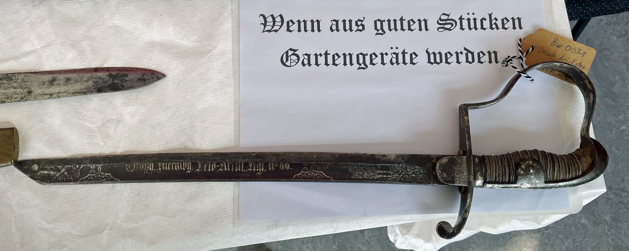 Mit dabei der restaurierte Hirschfänger, der die Vortragsreihe begann. Die Fehlstelle an der Scheide war nur unter Schwarzlicht zu erkennen.