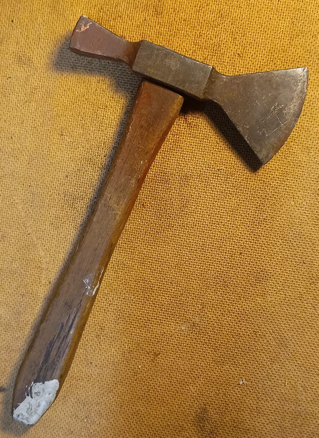 Ein Campingbeil ist's wohl nicht. Sieht aus wie ein Gipserbeil. Ein Axt-/Beilfreund schreibt, es ist ein französisches Dachdeckerbeil. Schauen wir mal. Vielleicht ergibt es sich ja, eine stich- äh hackfeste Zuordnung zu erfahren.