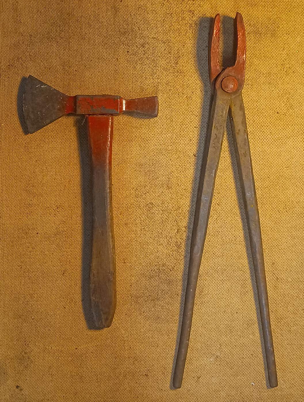 Der Betreiber weiß in etwa, was mich so interessiert und drückte mir ein kleines Beil in die Hand. Die schöne Schmiedezange gehörte vom Vorbesitzer dazu, zu erkennen an der roten Farbe. Hing als Deko, zusammen mit einer Blechschere, an der Wand. Die Blechschere habe ich aber nicht mitgenommen.