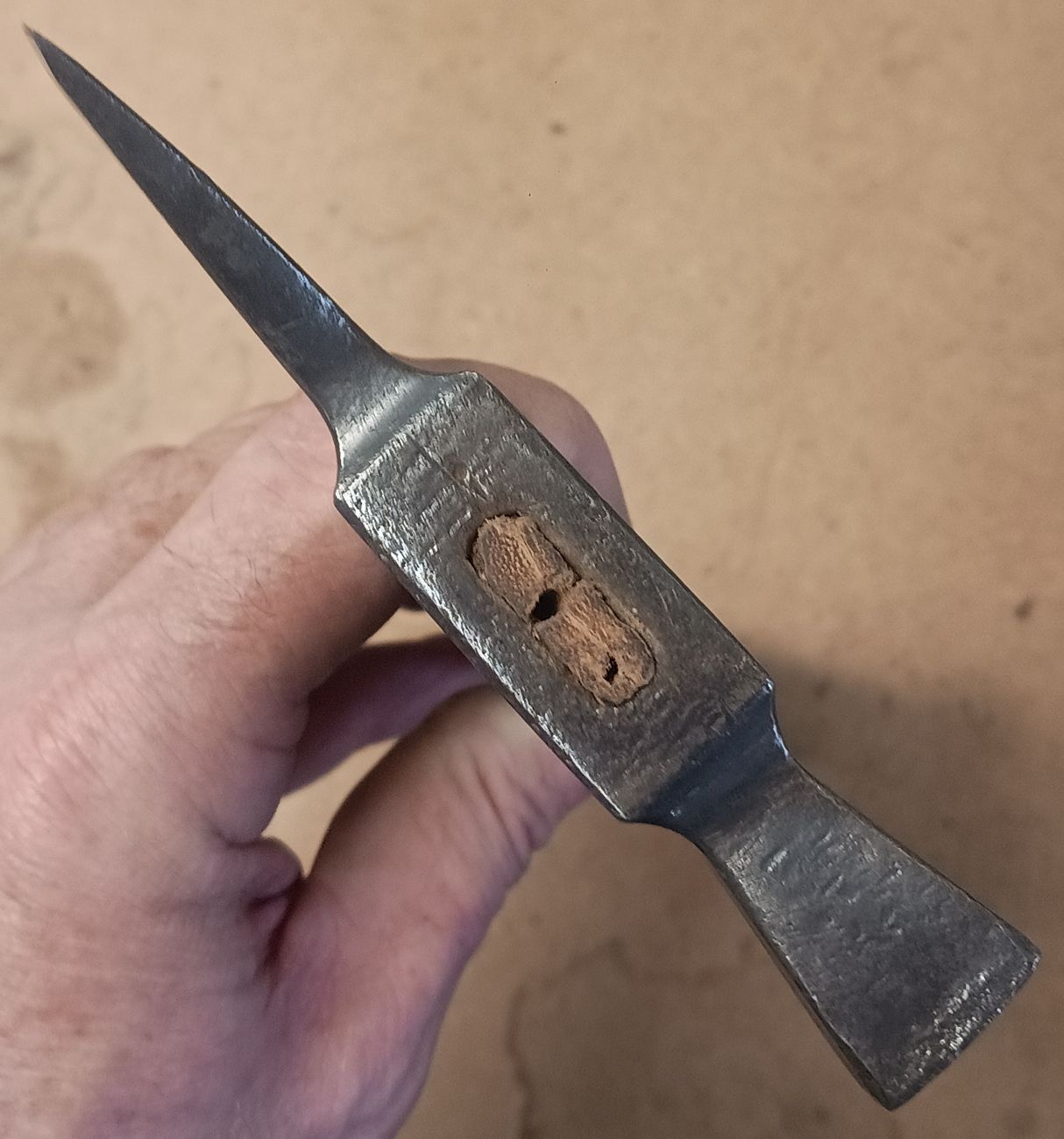 Anbei mal ein Zwischenstand nach der Reinigung und Schärfung der Schneide. Den Stiel lasse ich so, auch wenn es mir schwer fällt. Dieser ist, auch wenn es nicht so aussieht, dermaßen fest um Kopf, dass nicht einmal nach dem Ziehen der beiden Nägel eine Lockerung erfolgte. Selbst ein starkes Schlagen mit einem Eisen als Durchtreiber auf den Stiel trieb das Holz nicht durch. Der Stiel ist wahrscheinlich Eiche. In der Holzarterkennung bin ich aber weniger geübt.
