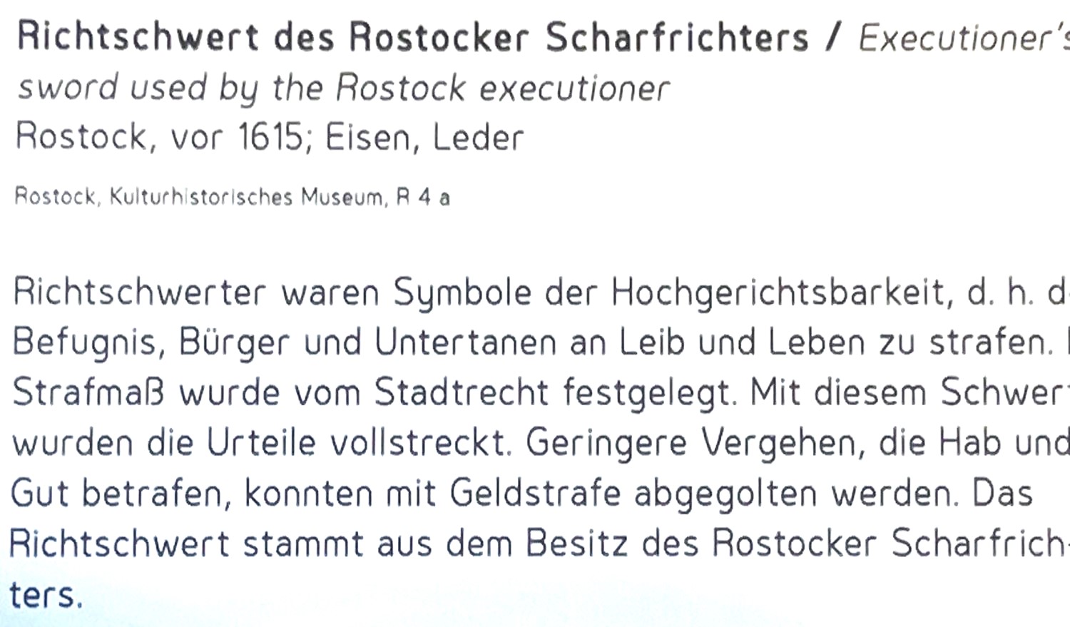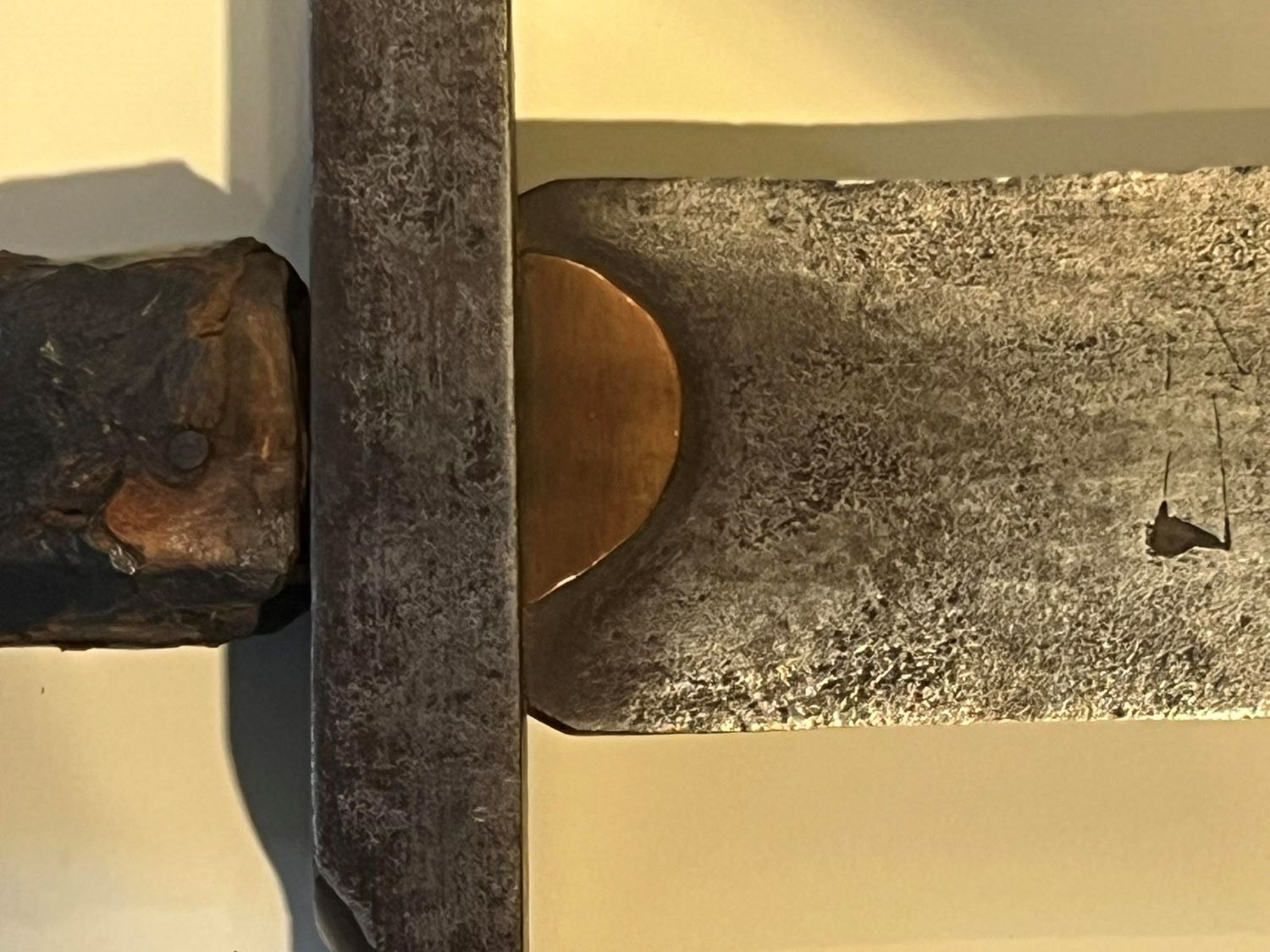 Sehr schönes Beispiel eines Richtschwertes. Die durchweg breite Klinge mit parallel laufenden Schneiden und der kleine, leichte Knauf lenken die Wucht des Hiebes auf das vordere Drittel der Klinge und machen es somit zu einem wirksamen Werkzeug. Die für ein Richtschwert sehr ausladene Parierstange besitzt in der Mitte die übliche Verdickung. Bei dem unter der Parierstange hervorschauenden Messing- oder Bronzeelement kann ich nur vermuten, dass es sich entweder um reine Zier handelt oder als zwischen Parierstange und Klingenschultern gesetztes Material handelt, was die feste Lagerung der Teile begünstigen soll (ersetzt Stoßleder?).