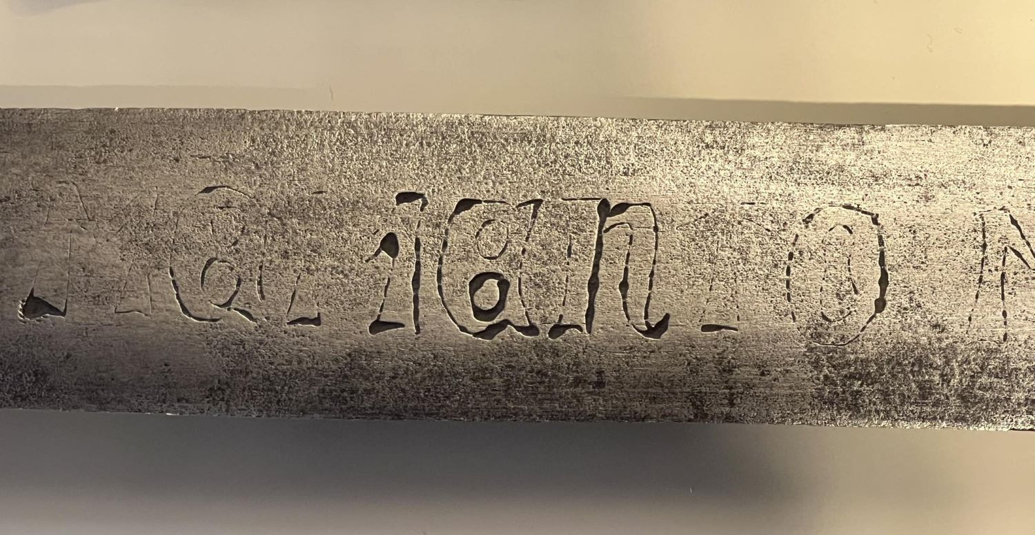 Die anscheinend geätzte Inschrift lese ich als "MEMENTO MORI". Hervorzuheben ist hier die Erhaltung der Scheide.