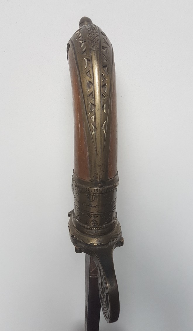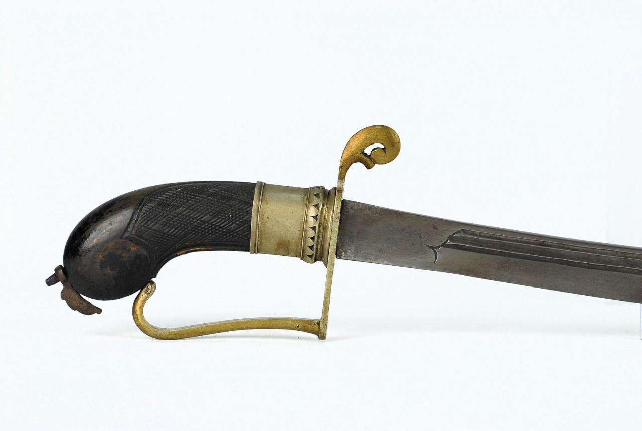 Das ist ein Parang Nabur aus Borneo. Das Parang-Nabur hat eine zweischneidige, gebogene Klinge. Die Klinge läuft vom Heft breiter werdend zum Ort. Der Ort ist abgerundet oder schräg abgeschnitten. Die Klinge hat einen oder auch mehrere Hohlschliffe, die kurz unterhalb des Klingenrückens verlaufen. Am Ort ist meist eine 20 cm lange Rückenschneide ausgearbeitet. Am Ort sind üblicherweise durchbrochene Verzierungen ausgearbeitet, wie sie sich bei den Parang- und Klewangarten finden. Das Heft besteht meist aus Holz oder Horn und ist mit einheimischen Schnitzereien verziert. Der Knauf ist meist in Form eines Fabeltiers geschnitzt. Am Heft ist in der Regel ein Handschutzbügel angebracht. Der Handschutzbügel und das Parier sind nach europäischem Vorbild gearbeitet. Die Scheide besteht meist aus Holz und ist zweiteilig. Es wird mit Bändern aus Metall zusammengehalten. Der Parang-Nabur wird von verschiedenen Ethnien Borneos (Kalimantan) benutzt.