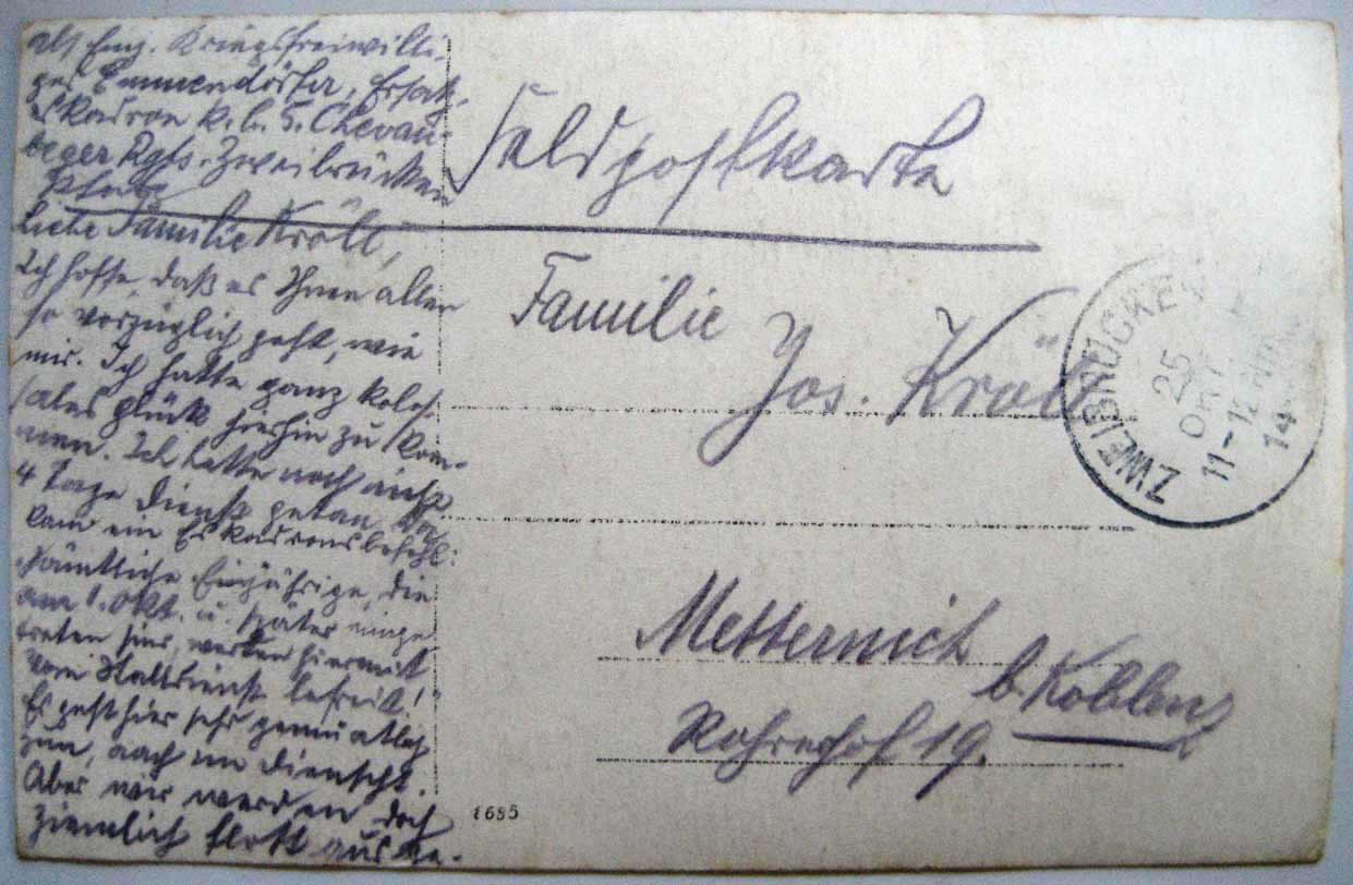 ich hoffe, daß es Ihnen allen so vorzüglich geht, wie mir. Ich hatte ganz koloßales Glück hierhin zu kommen. Ich hatte noch nicht 4 Tage Dienst getan, da kam ein Eskadronsbefehl: "Sämtliche Einjährige, die am 1. Okt. u. später eingetreten sind, werden hiermit vom Stalldienst befreit!". Es geht hier sehr gemütlich zu, auch im Dienst. Aber wir werden doch ziemlich flott ausge- (Weiter Kartenvorderseite unten) bildet. ... (Grußfloskeln)... 19. Oktober 1914