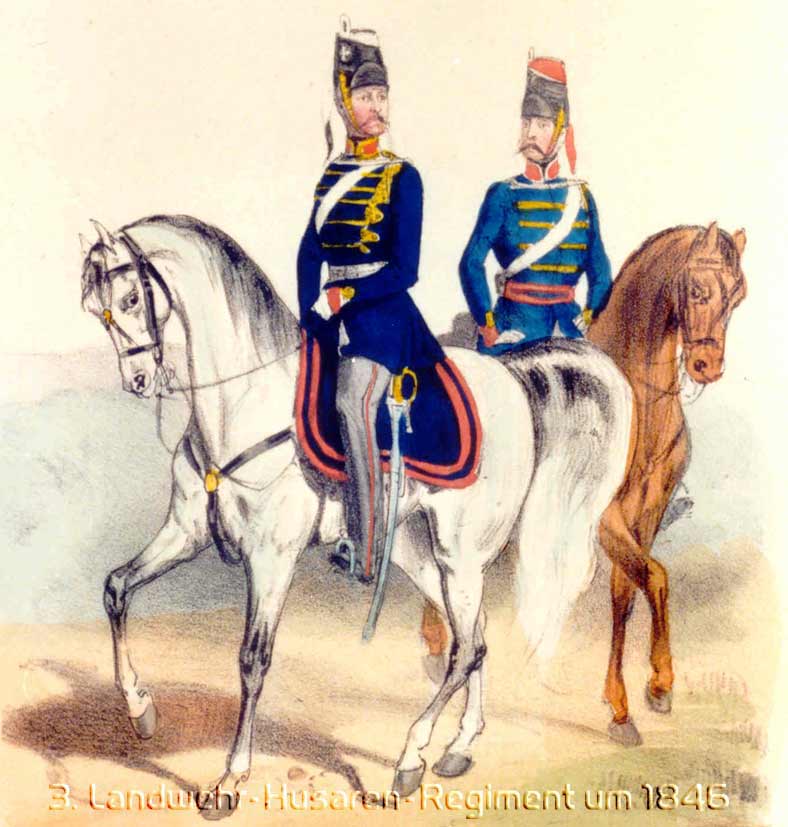 - Das Mützenabzeichen des Husaren ziert ein Kreuz über dem WR-Monogramm => Landwehr-Husar?