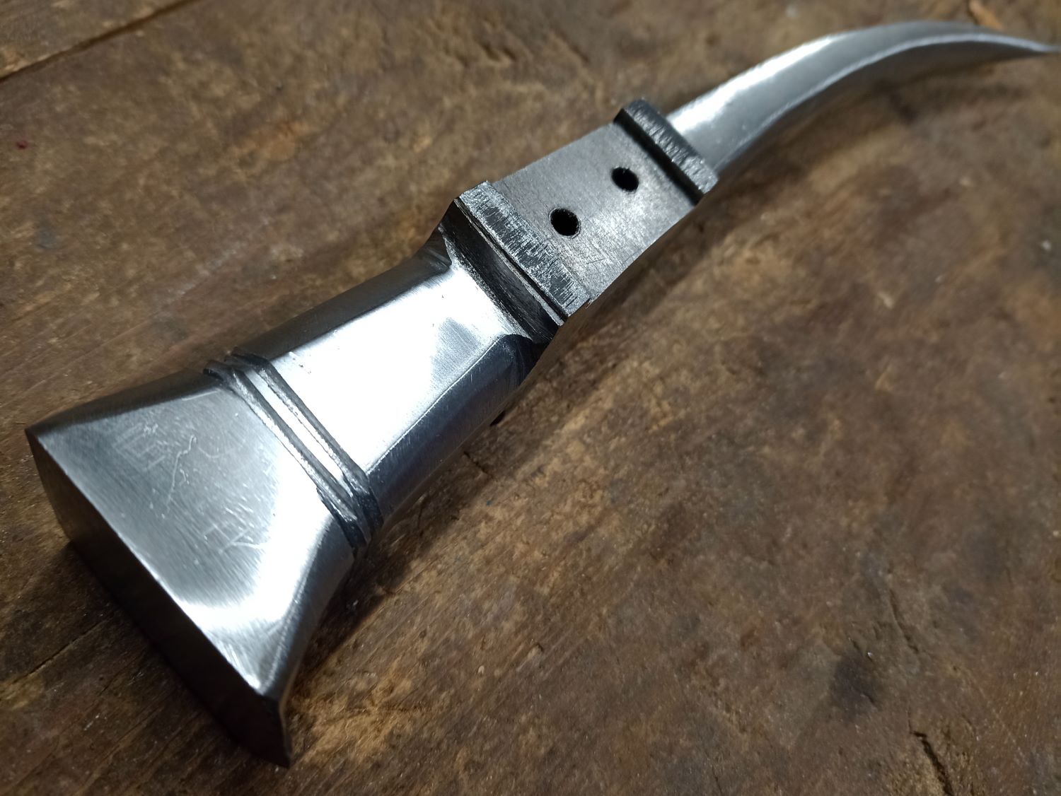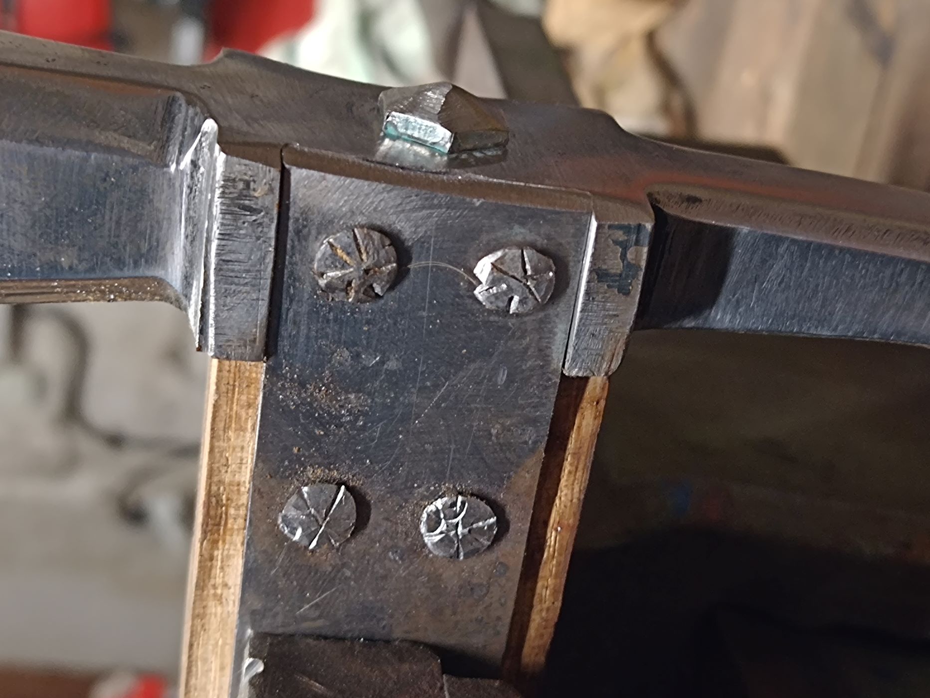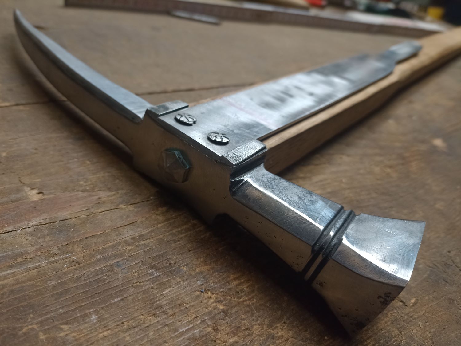 Ja, das ist tatsächlich so und ich weiß nicht, wie das bei den mit Holzstielen hergestellten Streithämmern gehandhabt wurde. Bei meinem verläuft eine lange Schraube von oben durch die Klammer, den Kopf bis in den Stiel hinein, wo sich in etwa die Messingniete befindet. Der Stiel ist mir auch zu schmal geworden. Der würde zwar halten, wäre aber auch ein bisschen zu "flexibel.