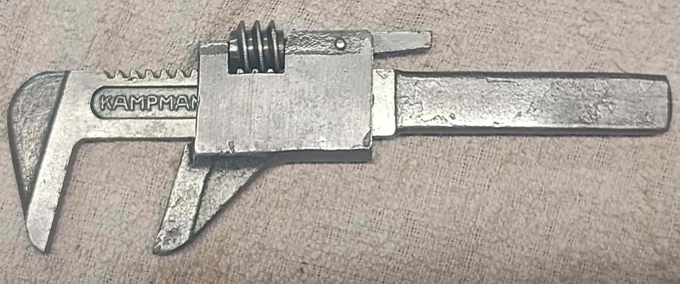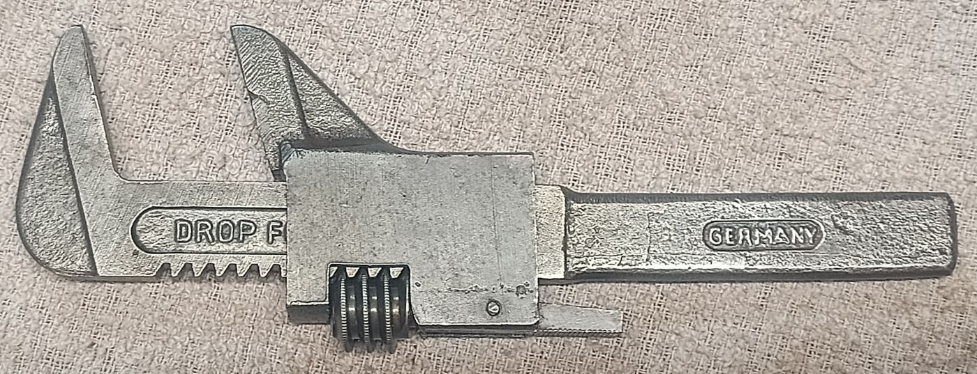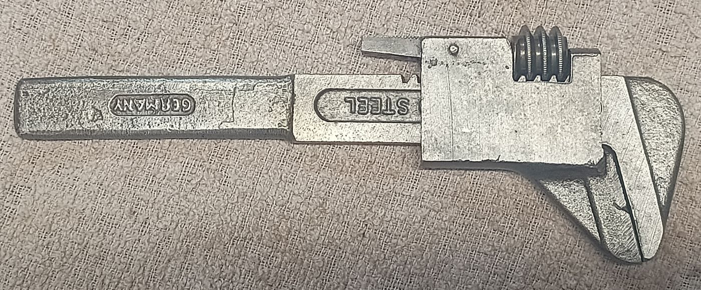 Dieser Schraubenschlüssel beherbergt trotz D.R.G.M. Markierung keinen besonderen Mechanismus, aber ein aufgelöstes Logo mit einem Schraubenschlüssel, weshalb sich dieses Stück hier vorstellen darf. Was mich etwas verwundert, ist wohl die Tatsache, dass jemand durch herbe Schläge den Stiel zuerst so deformiert hat, dass der Schlüssel nicht mehr zerlegt werden kann und dann diesen grau lackiert hat. Der Lack ist mir im Fundzustand nicht aufgefallen, da der Kamerad derart verdreckt, verkrustet und verrostet war. Ich hatte auch schon begonnen die "Deformation" wegzufeilen (Hüstel), als mir aufgefallen ist, dass das Ganze so gewollt sein könnte. Dank holzwerken.de konnte ich den Hersteller auflösen: „Curt Holzberger, Kötzschenbroda, Sa.“ Ich habe in einem