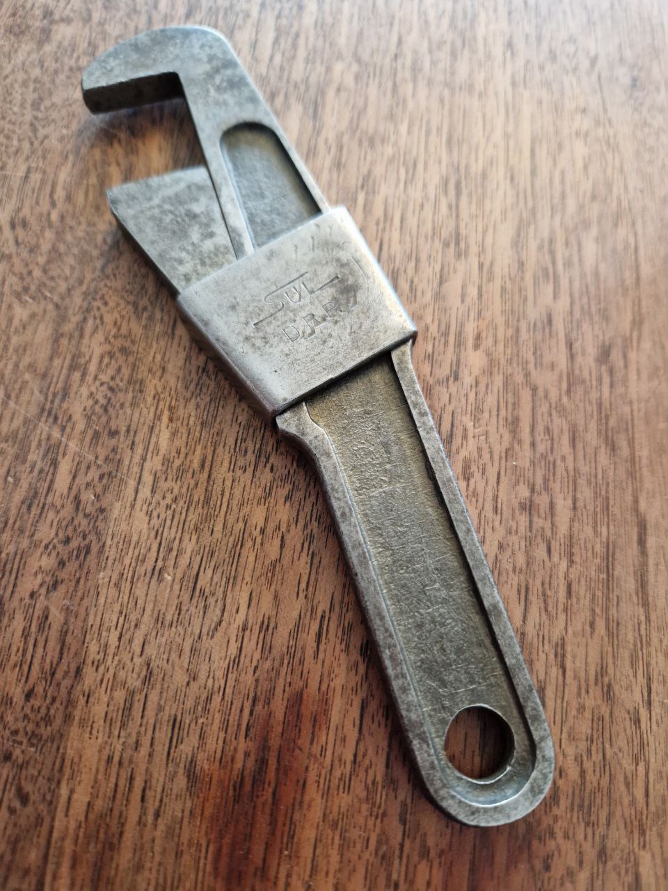 Hier ein vollständig anderer Mechanismus, der jetzt zu meiner Sammlung gefunden hat: Ein Verstellschlüssel der Marke Sul mit einer D.R.P. Markierung, 255 Gramm Gewicht und 17,9 cm Länge: