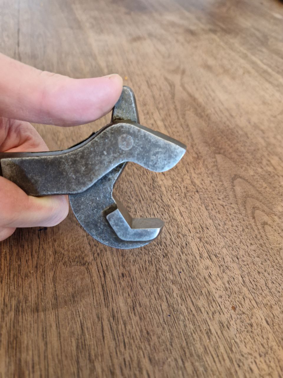 Der "EINHÄNDER" mit D.R.G.M. Markierung lässt sich aufgrund seiner Federfunktion mit einer Hand bedienen. Man öffnet mit dem Daumen das Maul, das sich selbstständig um die Mutter oder Schraube zieht. Der Federmechanismus funktioniert noch, auch wenn wohl eine der beiden Federblätter abgebrochen ist. Bis auf die unten beschriebenen Markierungen findet sich kein Herstellerstempel.