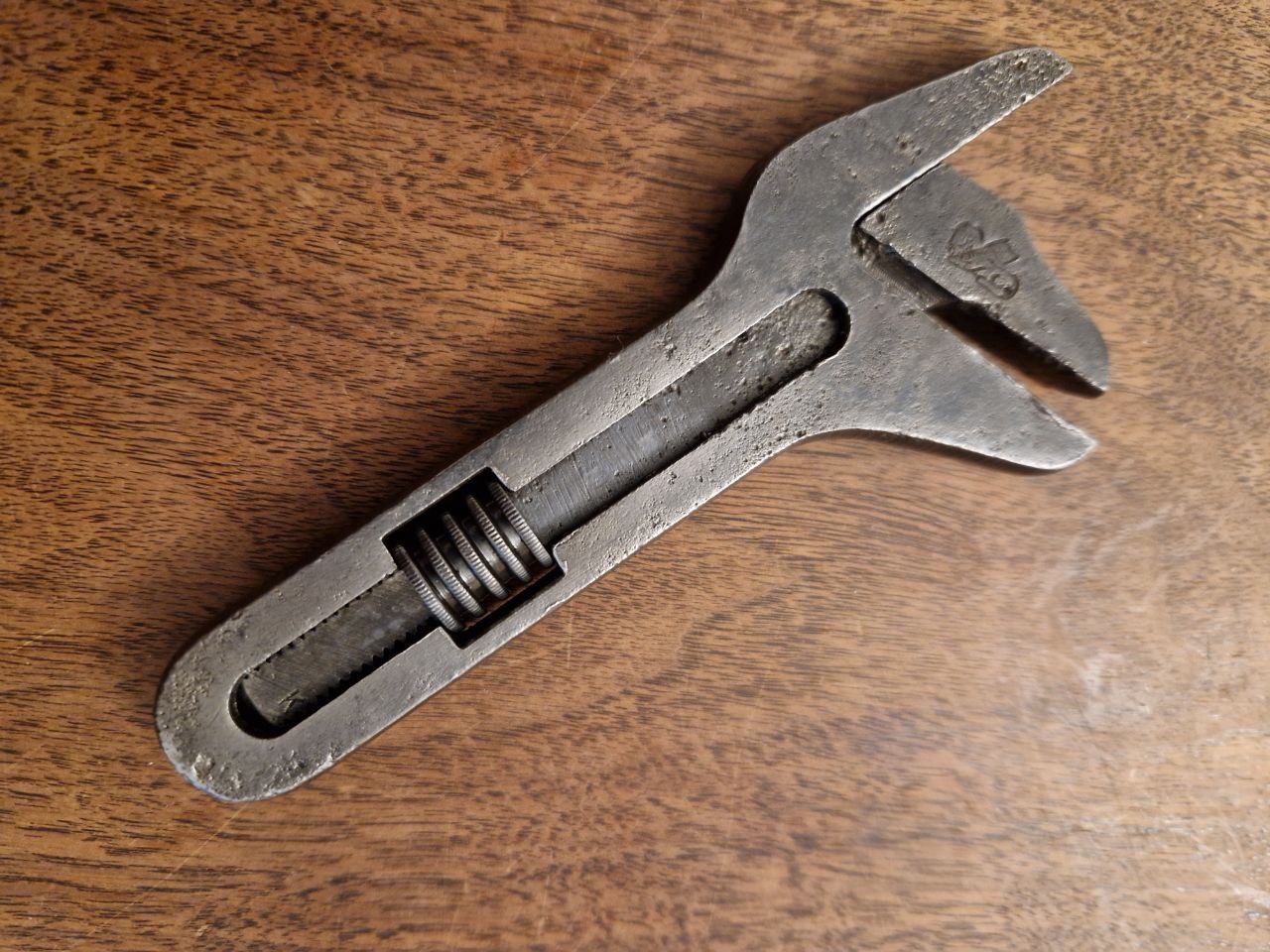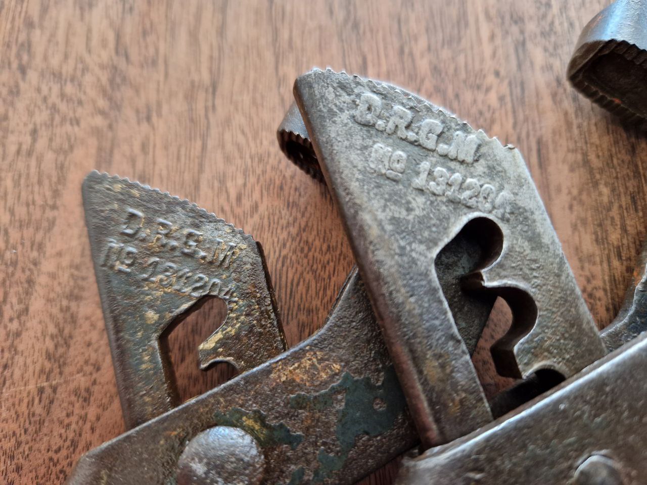 Hier wohl meiner Meinung nach der Klassiker aller Klassiker der Verstellschlüssel: So einen habe ich mir als erstes Werkzeug als Student aus einem Baumarkt erworben und so ein Stück ist mir erst letztens wieder als zerbrochenes Billigprodukt aus Fernost durch die Finger beim Schrotthändler geglitten. Hier nun einer mit 268 Gramm Gewicht, 24,6 cm Länge und einer D.R.G.M. Markierung: