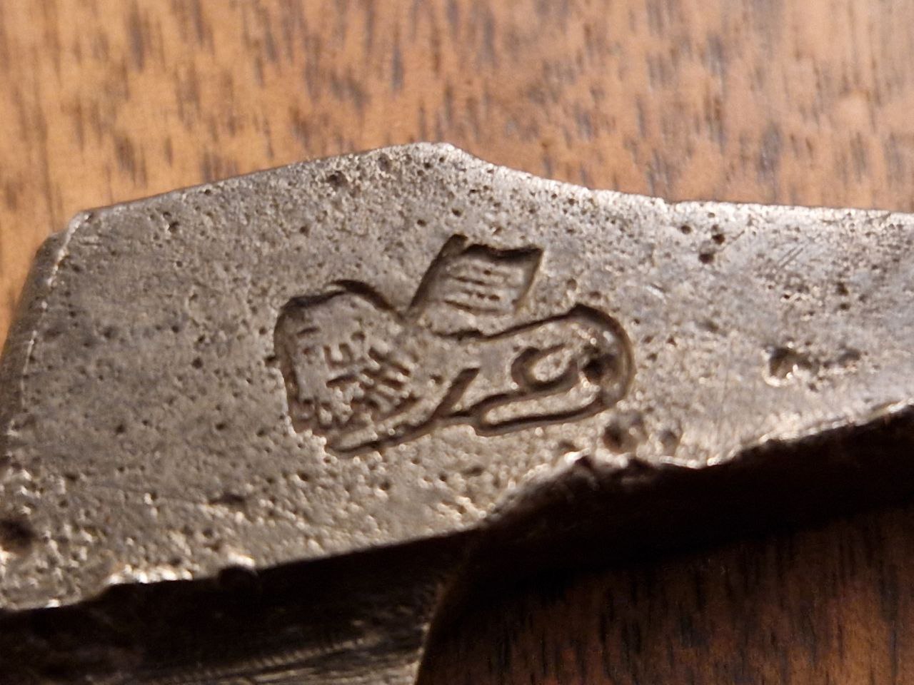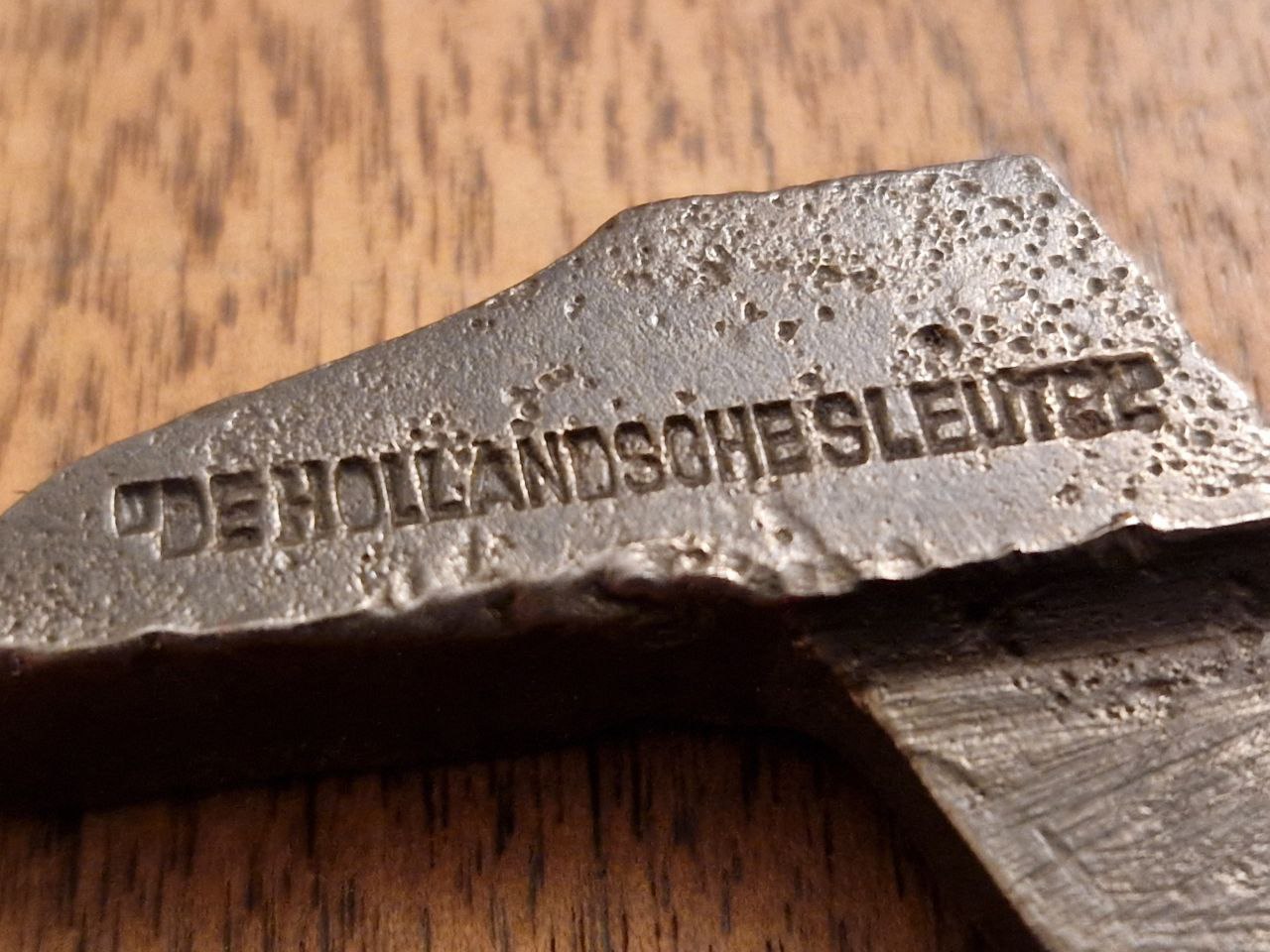 Heute kein "Kaiserlicher", sondern mit 14,2 cm Länge und 233 Gramm Gewicht ein kleinerer, dafür "langohriger", holländischer Geselle: Seine Markierung: "DE HOLLANDSCHE SLEUTEL" heißt übersetzt: der niederländische Schlüssel. Den Hersteller habe ich nicht herausfinden können. Das Logo deute ich als Sphinx mit Fahne.