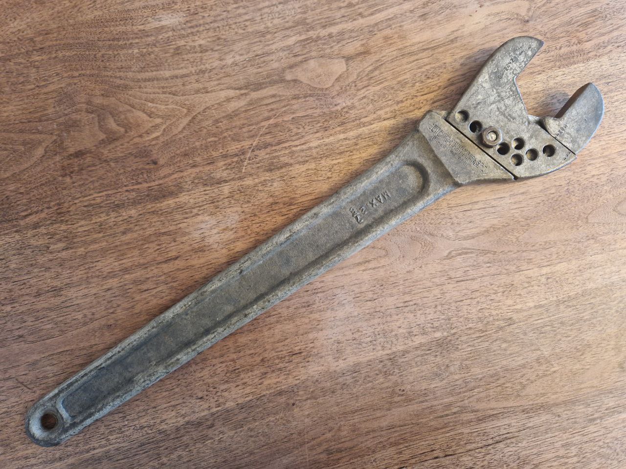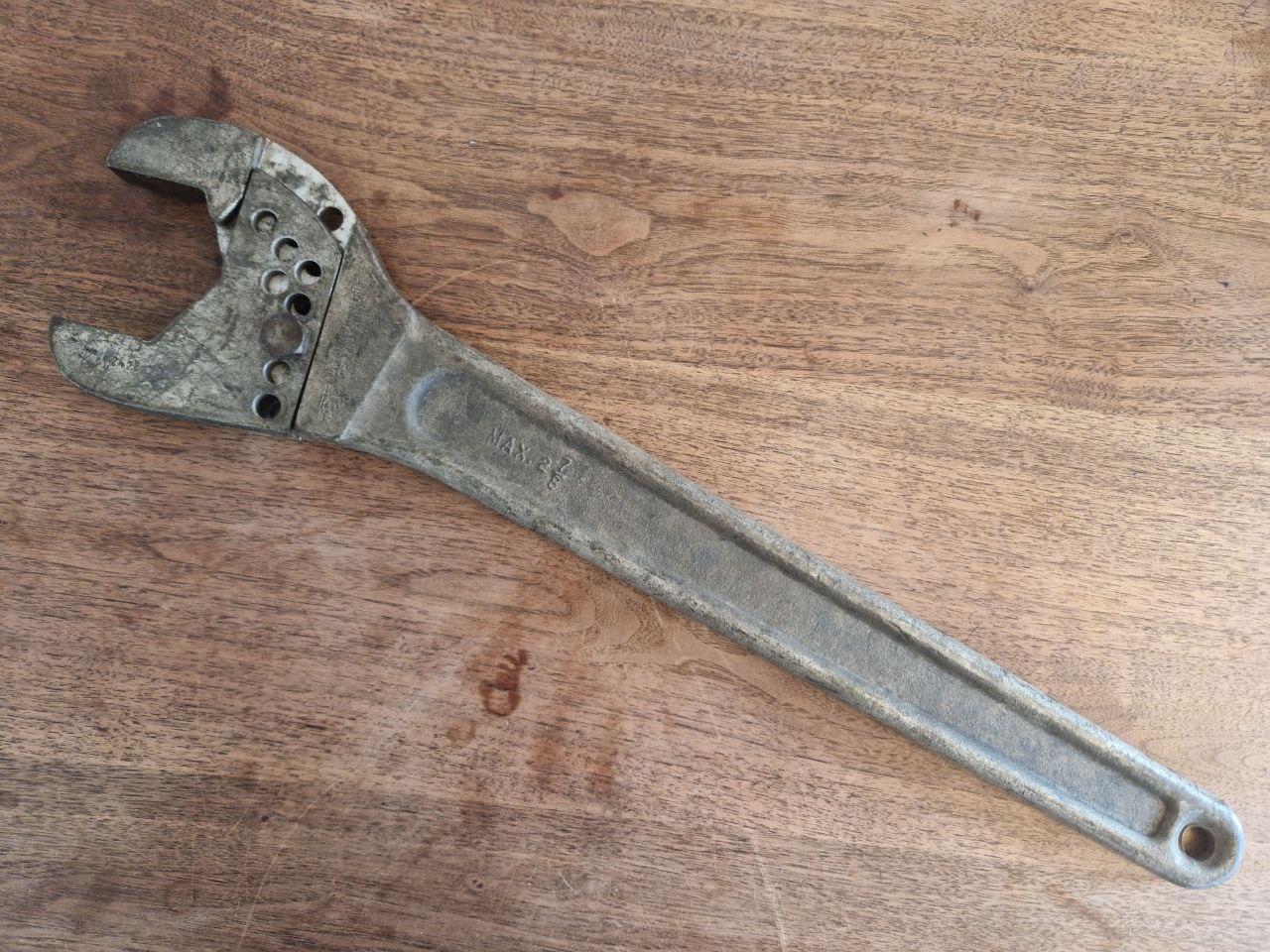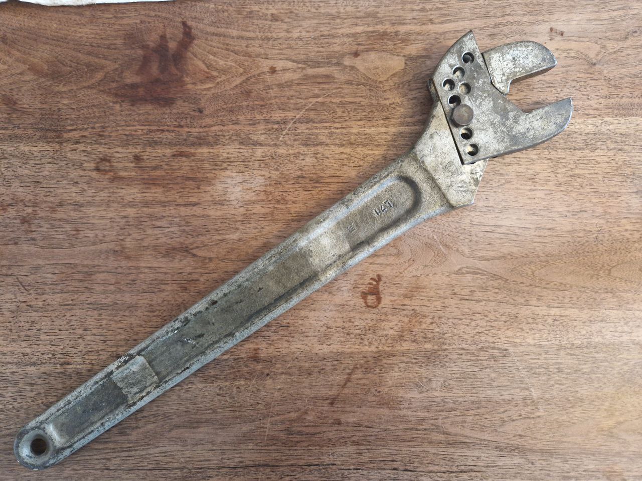 Mit 60,3 cm Länge und 4033 Gramm Gewicht stellt dieser mächtige Verstellschlüssel den neuen Längen- und Gewichtsrekord seiner Art in meiner Sammlung auf. Damit ist aber für meine Verhältnisse mein persönliches Maximum erreicht. Grund für den Erwerb dieses allgemein etwas selteneren Schlüssels ist seine Verstellfunktion: Diese funktioniert mittels einer Schraube und vieler Löcher in beiden Gabeln: man steckt diese in eines der Löcher beider Gabelstücke und fixiert diese mit einer Mutter. Also ein Schraubenschlüssel, der zur festen Stabilisierung seiner Funktion zwei weitere Schraubenschlüssel benötigt. Allerdings dürfte ein Festdrehen mit der Hand wohl ausreichen.