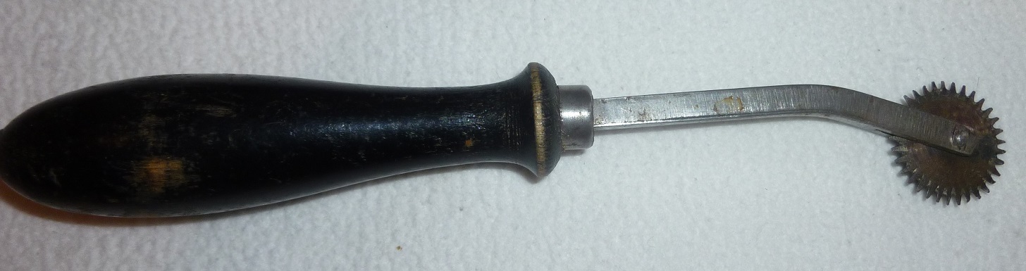 Hier haben wir ein sog. "Überstichrad", das dazu verwendet wird, ein Lederstück vor dem Vernähen zu perforieren, um dann durch die vorgestochenen Stellen den Faden nähen zu können.
