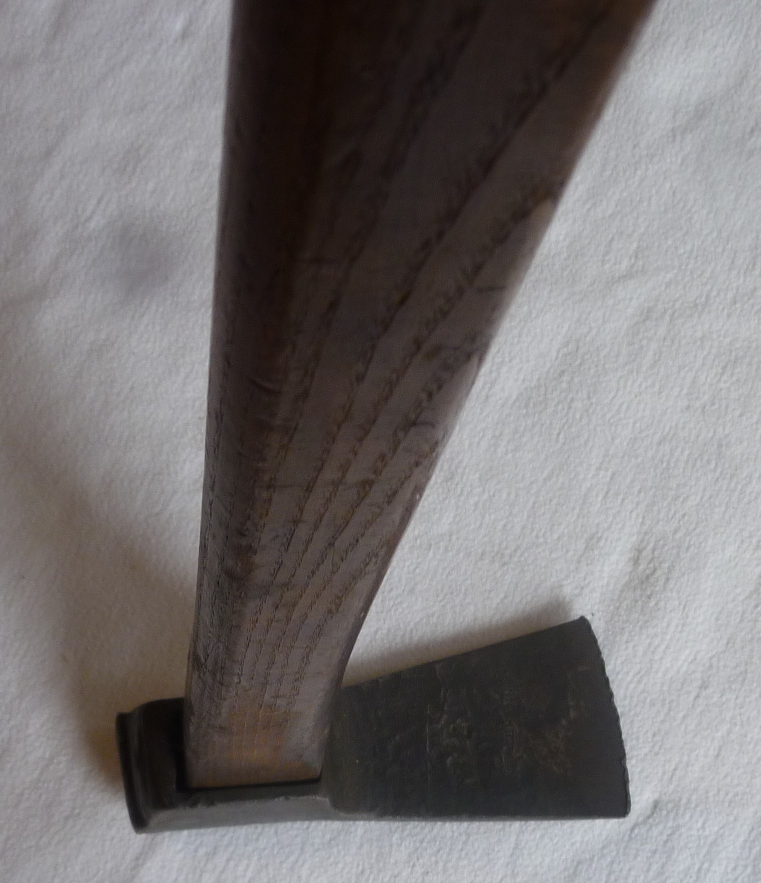 Der Stiel ist mit einem Querschnitt von 2x3,2cm recht dünn, was eine Verwendung als Beil meines Erachtens ausschließt. Die Schneide weist außerdem Gebrauchsspuren auf, die auf Kontakt mit Metall schließen lassen. Ein regelrechter Grat ist entstanden. Daher würde ich eine Verwendung in Verbindung mit Holz verneinen.