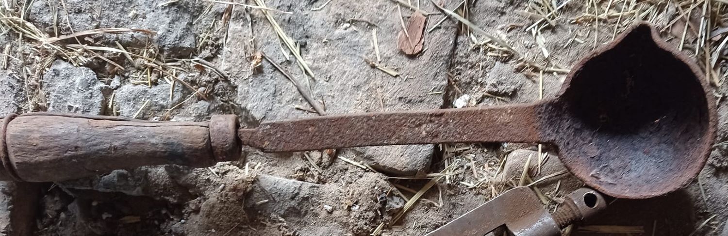 Eine handgeschmiedete Kelle um z.B. Stangen- und Streuzinn herzustellen. Zum Schmelzen des Metalls wird es mit der Kelle direkt ins Schmiedefeuer gelegt.