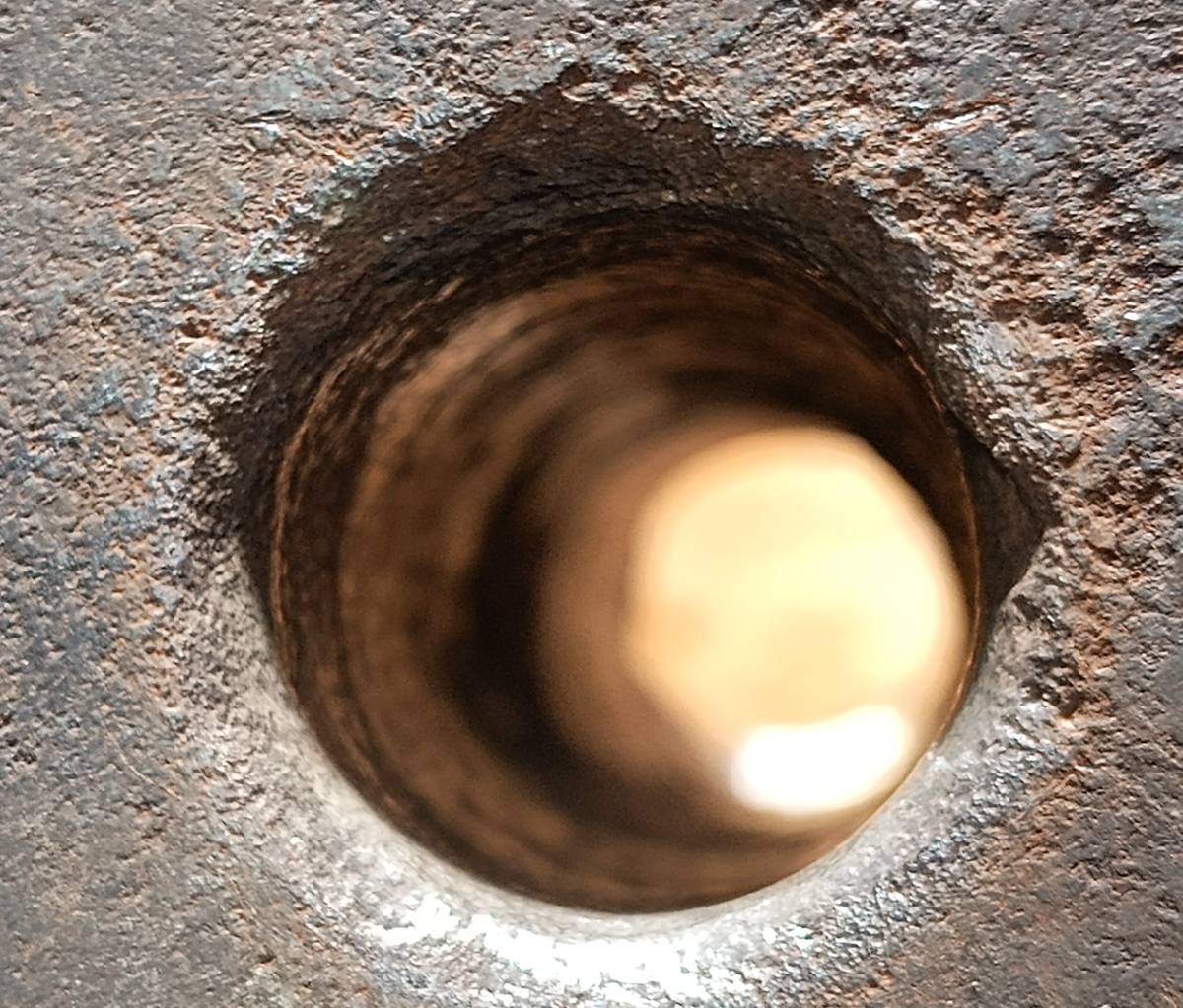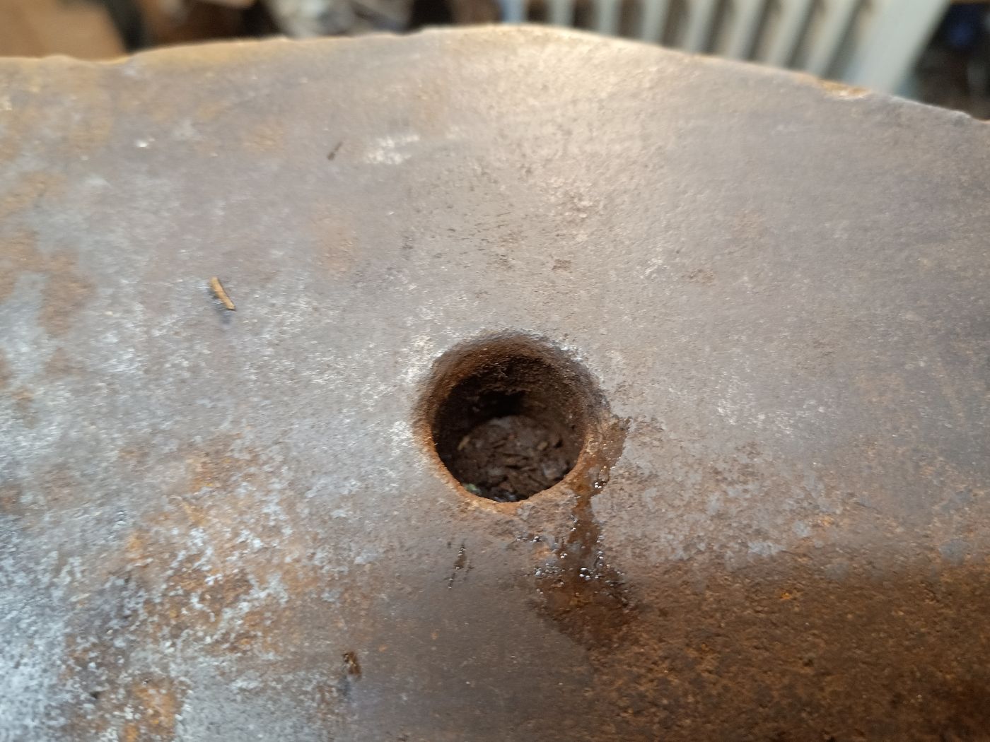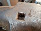 Sonntag auf die "Schnelle" die beiden Löcher frei gemacht. Das mit 22x22mm messende Vierkantloch war mit Kupferdraht, abgeschnittenen Schrauben und Dreck verstopft und das mit 21mm im Durchmesser messende Rundloch mit Muttern und Dreck. Das erste Foto zeigt das Rundloch von unten. Da steckt eine Mutter fest, die ich ausbohren musste. Ich kenne diesen Zustand auch von den anderen Ambossen. Jetzt hat man wieder den Durchblick.