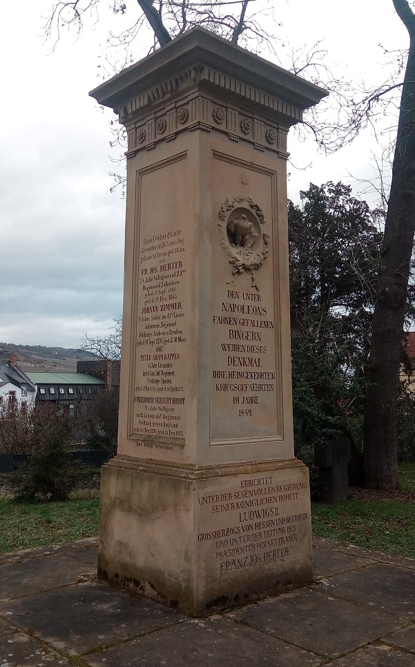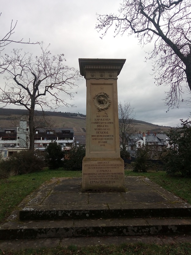 Errichtet wurde es 1842 im Stile der Zeit von den Veteranen als Verbeugung vor den gefallenen Bingern. Schön ist besonders, daß bei jedem der erwähnten Namen die Truppenzugehörigkeit vermerkt ist und die Feldzüge, an denen der Genannte beteiligt war, als letzter schließlich ein Herr Brodt, der 1874 gestorben ist.