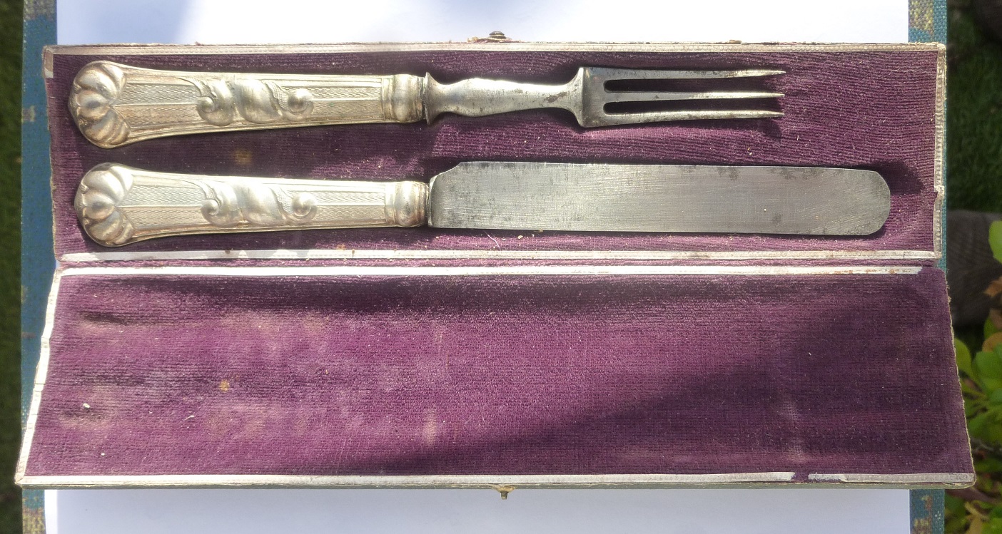 Hier nun ein Messer-und-Gabel-Set im Jugendstil. Es stammt von meiner Großmutter und ist so zierlich, daß es sich durchaus um Kinderbesteck handeln könnte. Oder aber auch irgendein Sonderbesteck. Da meine Großmutter Jahrgang 1898 war, ist beides denkbar. Das Besondere: das Set befindet sich noch in der Originalschatulle!