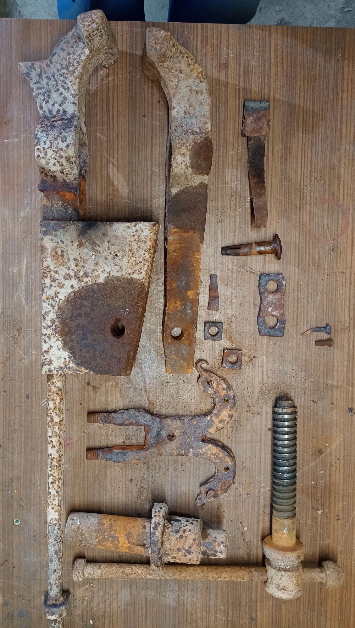Einige mittelgroße Teile habe ich mit Elektrolyse vorbehandelt. Anschließend alle Teile mit unterschiedlichen Drahtbürsten vom Rost befreit und zum Schluss mit Rostlöser aus der Spraydose eingeweicht und abgerieben. Das untere Ende der Feder war etwas abgenutzt. Da habe ich eine Schicht aufgeschweißt.