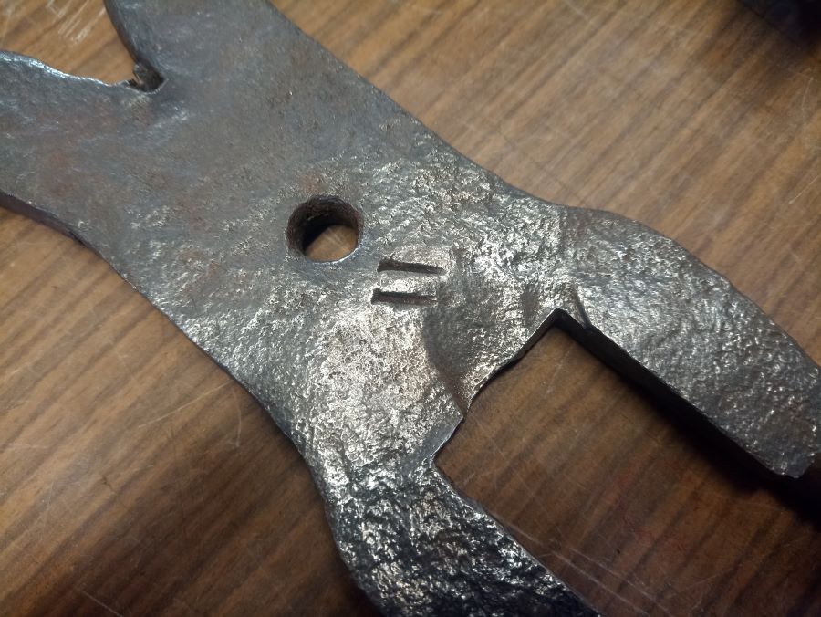 Entdeckt habe ich auch ein "Stückstempel" an mindestens drei der Einzelteilen, in Form einer II. Der Rücken des hinteren Teils, welcher als Fuß ausläuft, hat zudem auch einen Körnerpunkt und sieben Kreuze. An der Erhaltung dieser eingeschlagenen Zeichen erkenne ich, dass die raue Oberfläche der Teile schon bei der Herstellung entstand und nicht durch den anschließenden starken Rost.
