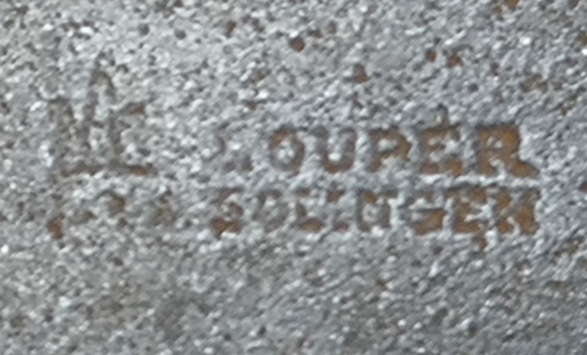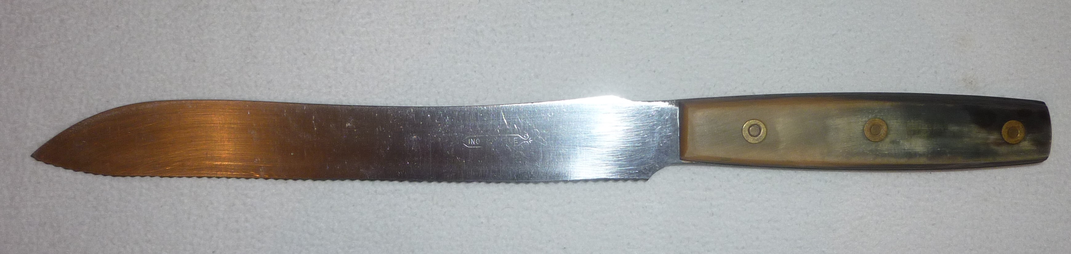 So, hier das Brotmesser. Die Marke ist leider völlig verputzt, nur noch das "INOX" (rostfreier Stahl) ist zu erkennen, die eigentliche Marke ist unleserlich.