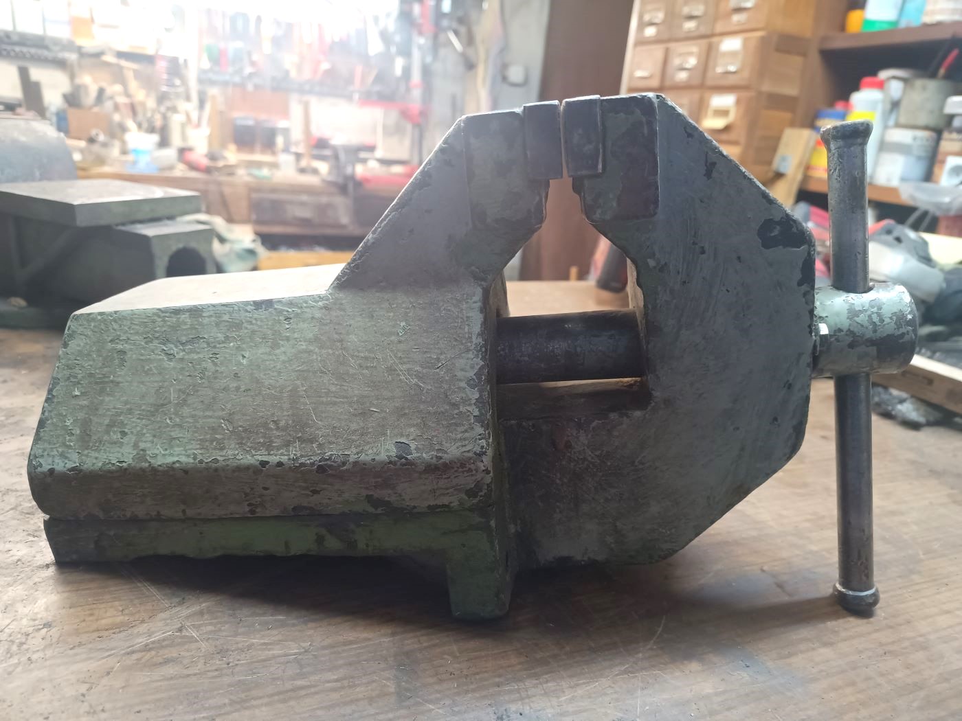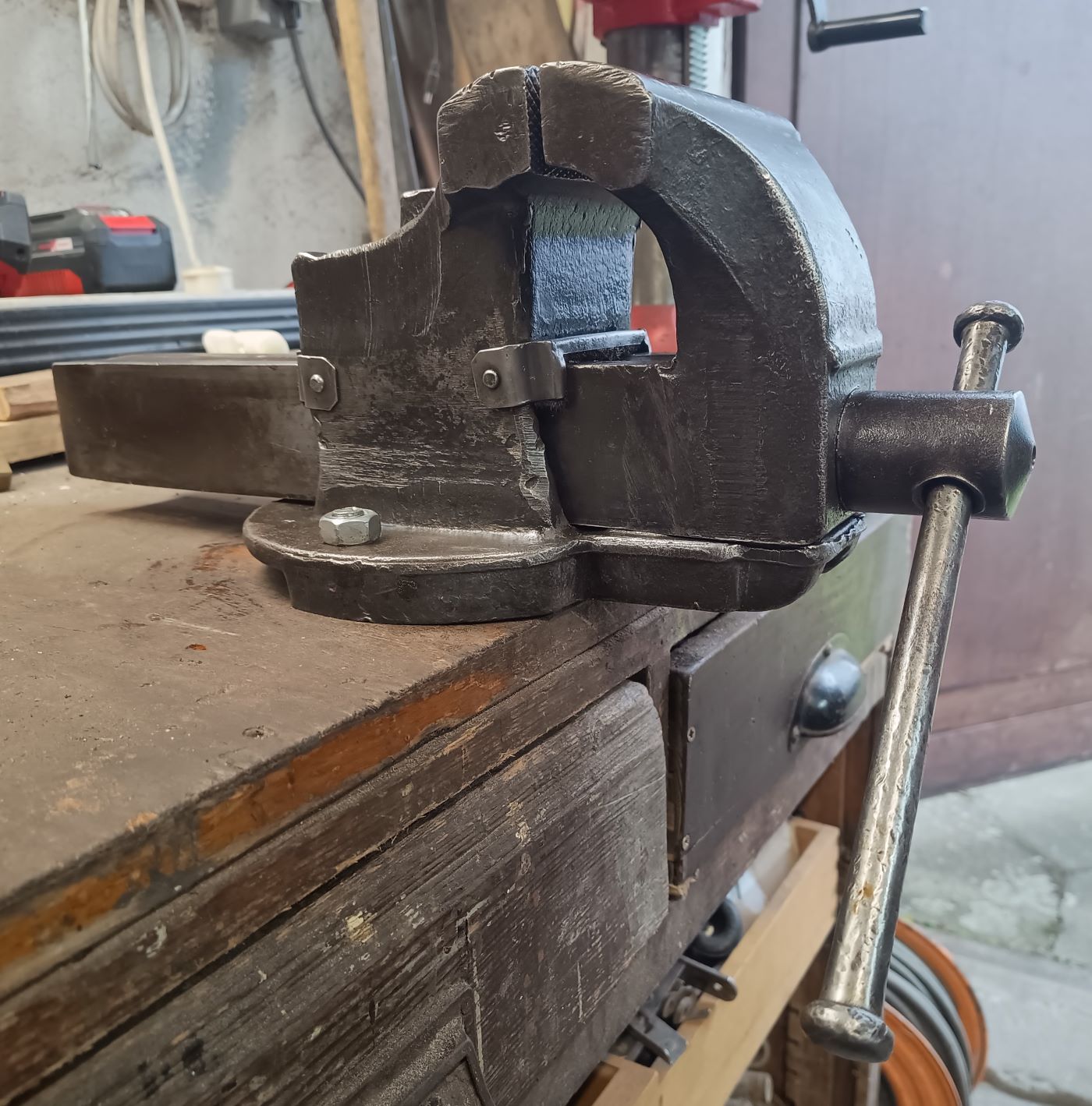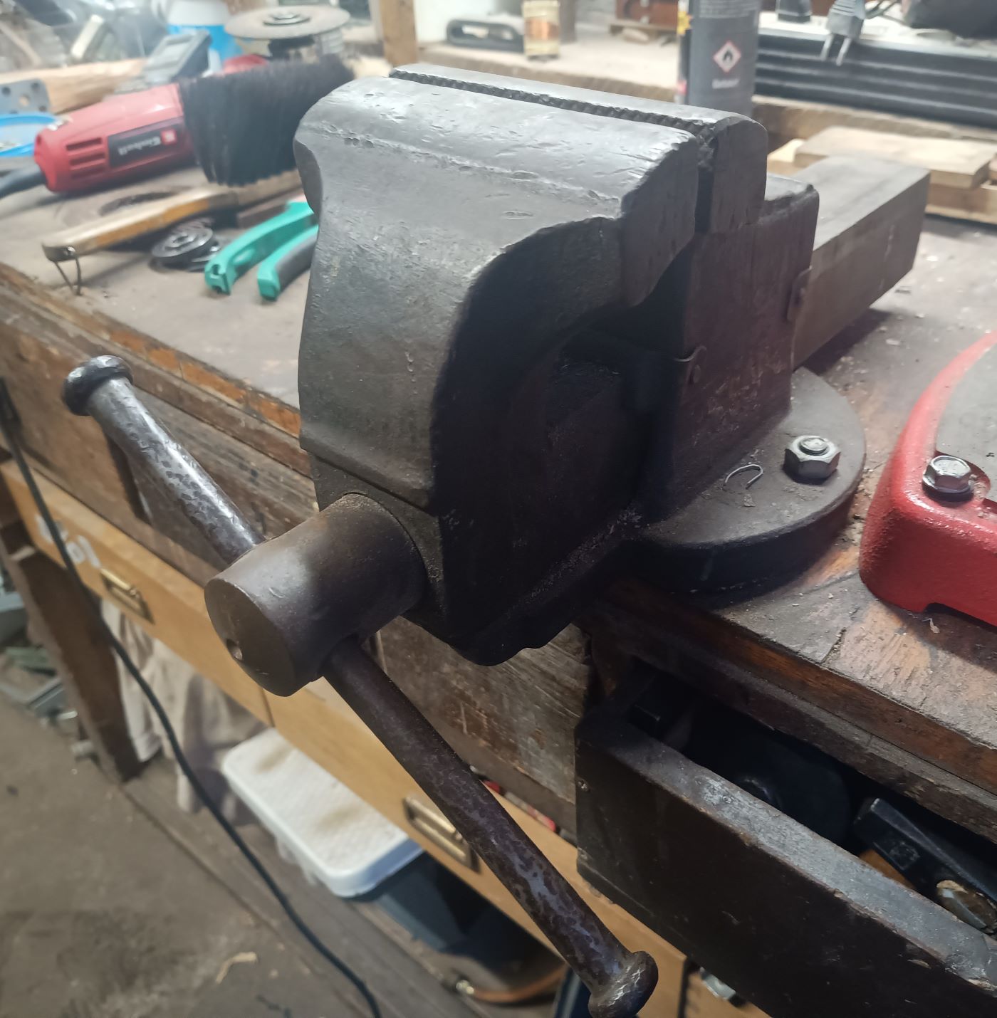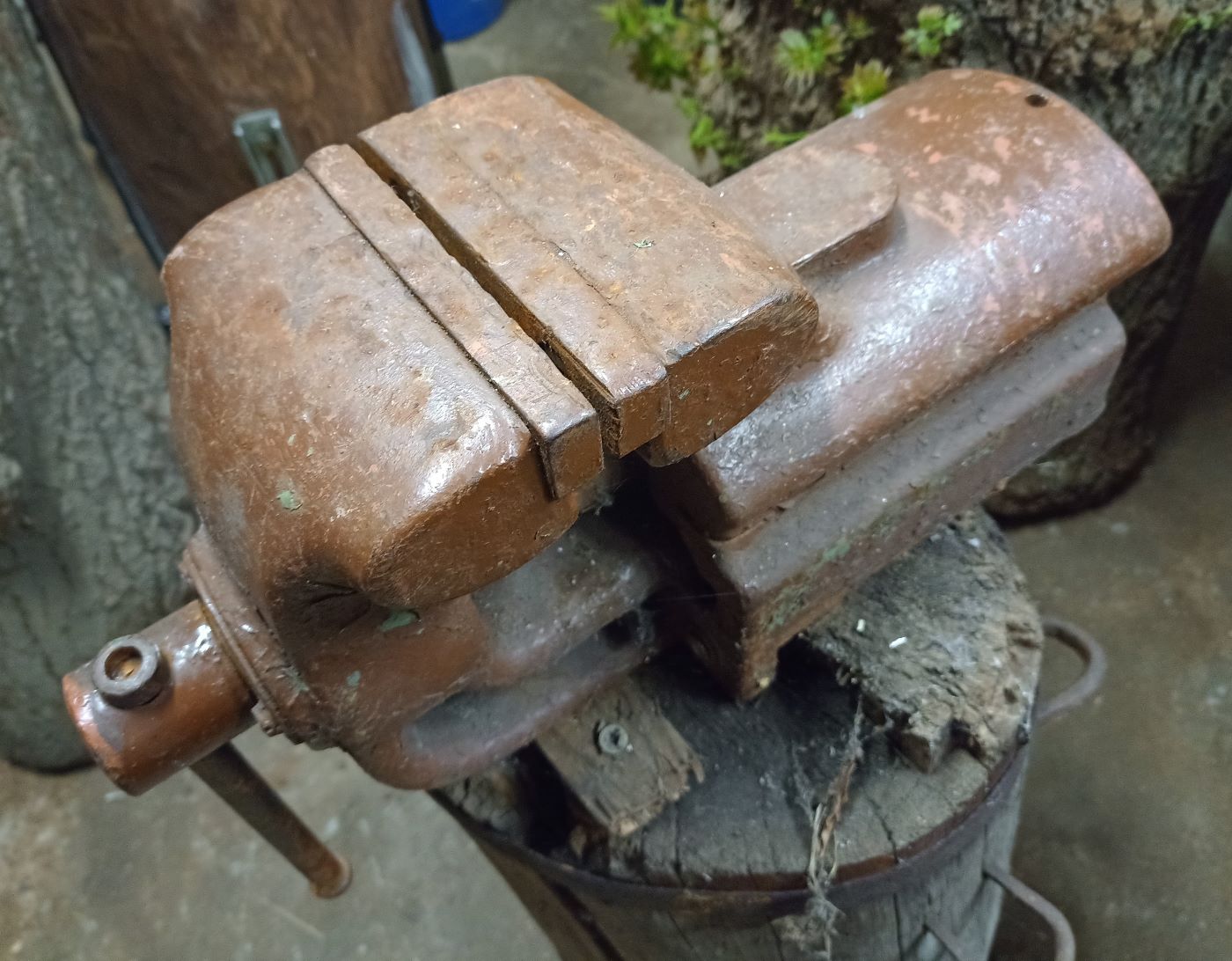 Ich habe fünf Parallelschraubstöcke unterschiedlicher Art in Gebrauch. Dieser hier kam zuletzt hinzu. Er gehörte dem Vater einer Freundin. Seit er 1990 herum mit nur 50 Lebensjahren starb, blieb er im Gartenschuppen stehen. Über die Jahre wollten ihn schon einige Bekannte der Freundin haben, teilweise sogar, um ihn auf den Schrott zu bringen. Das lehnte sie stets ab und wartete auf den Augenblick, jemanden zu vertrauen, der ihn wieder herrichtet und seiner ursprünglichen Bestimmung zuführt. Nun bin ich es geworden.