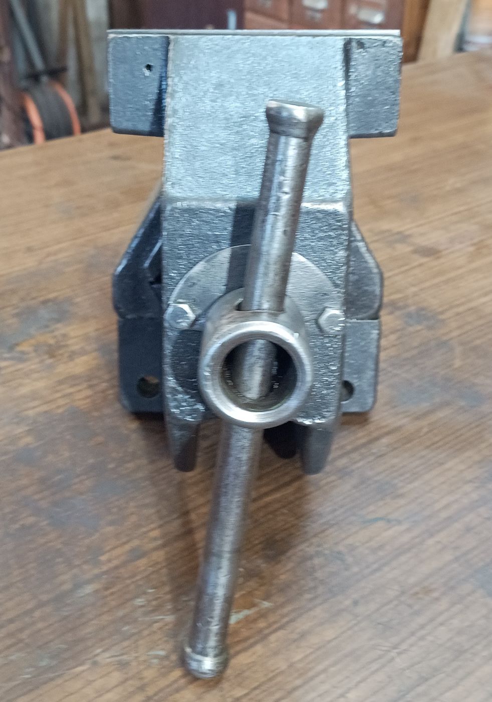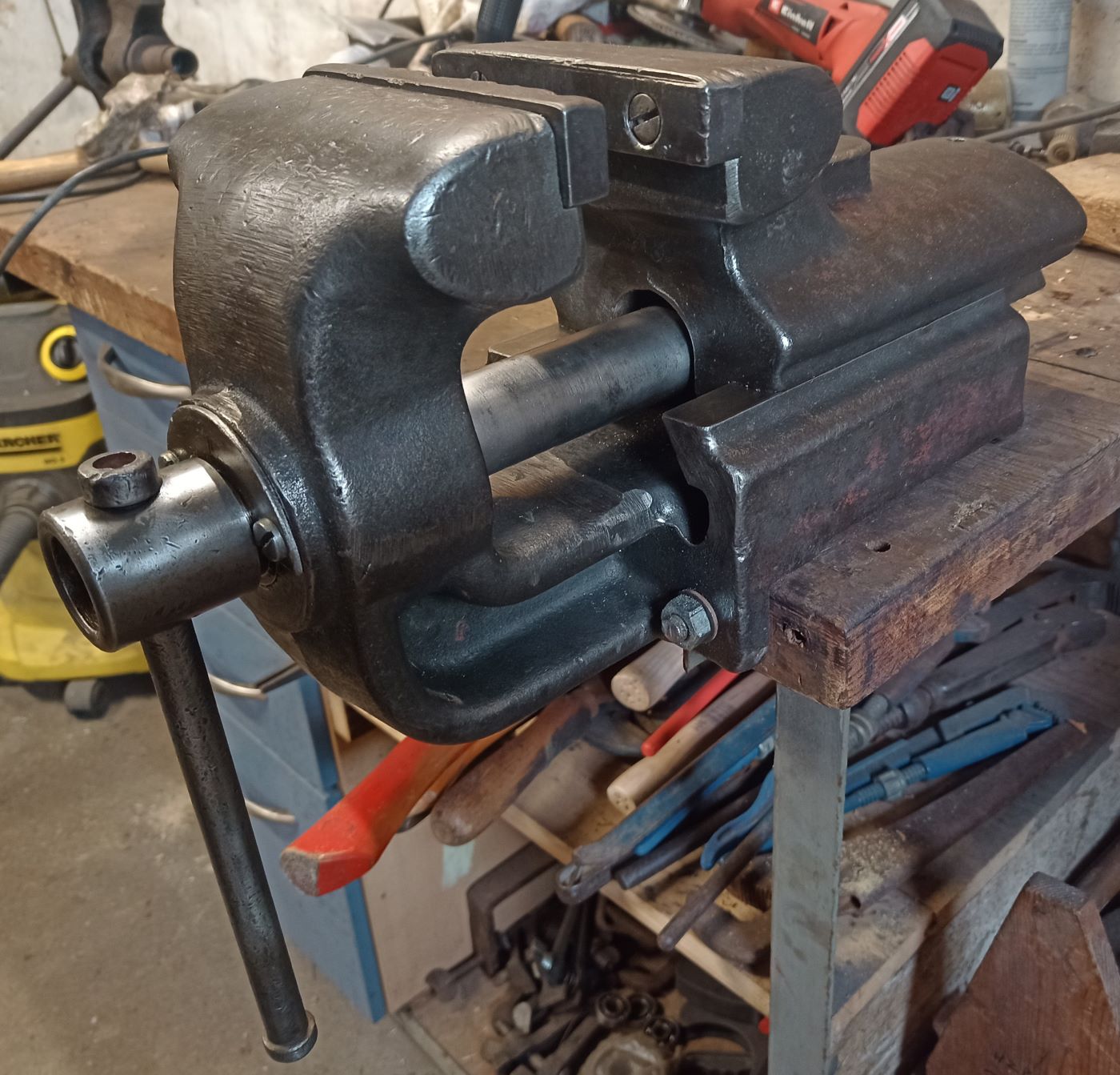 Hier ist er nun, vorgestern fertig geworden, nachdem ich ihn zerlegt, von Rost und Farbe befreit, geölt und gefettet und auf eine meiner Werkbänke montiert habe.