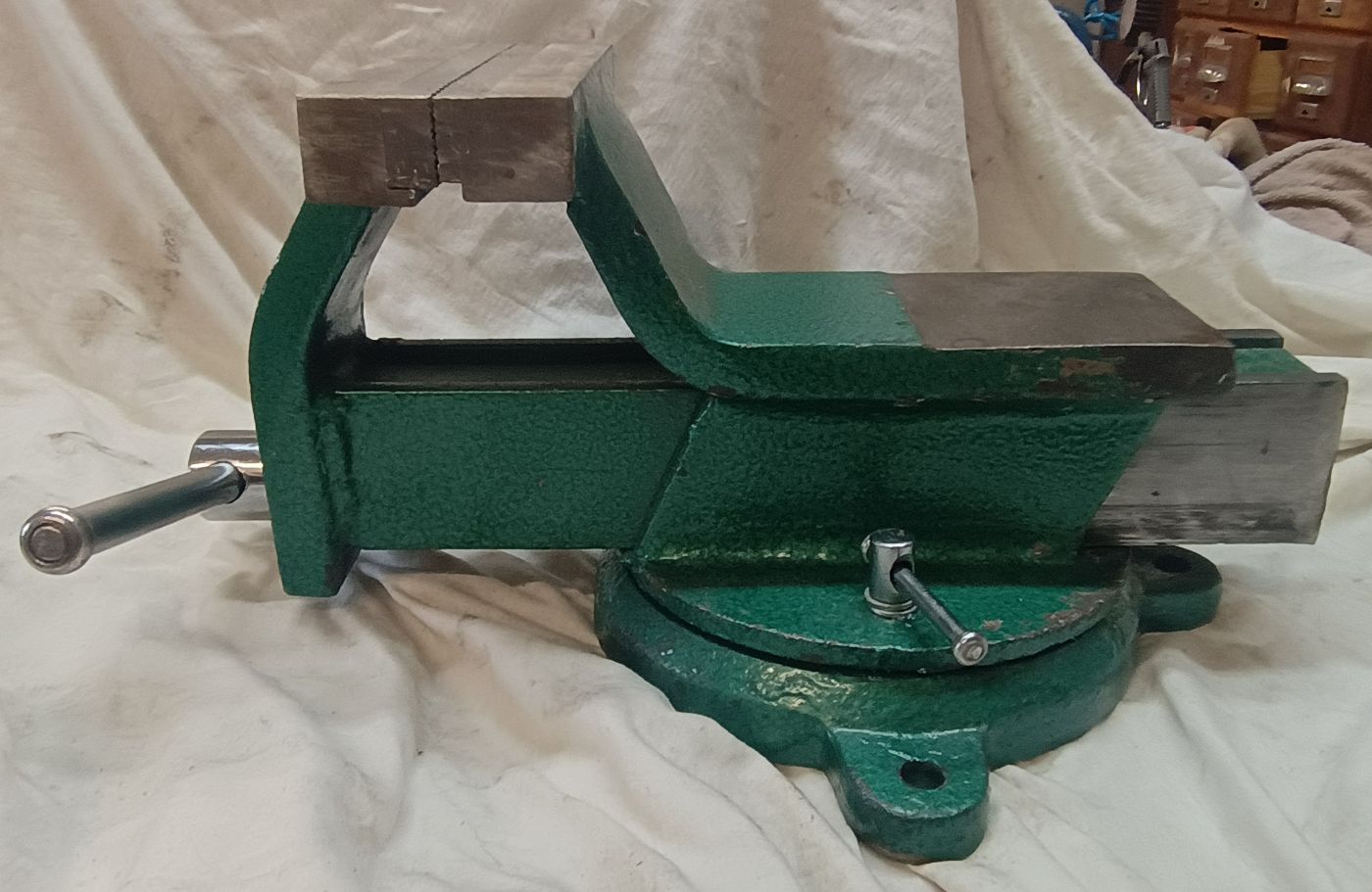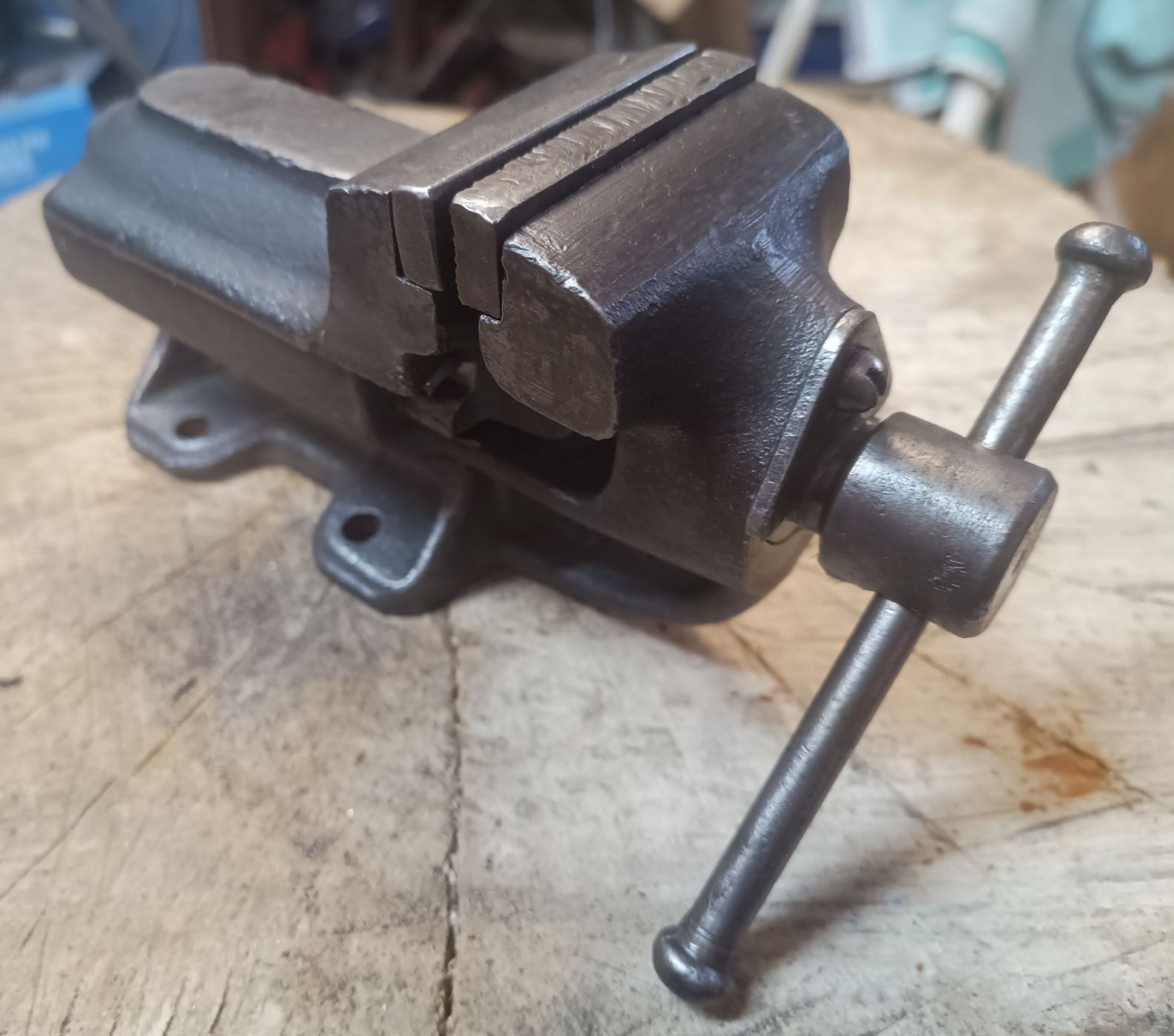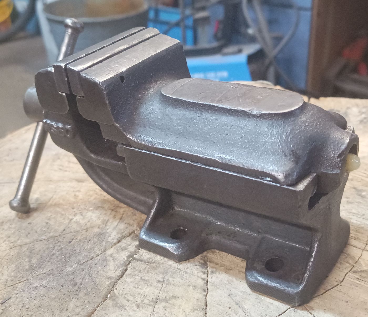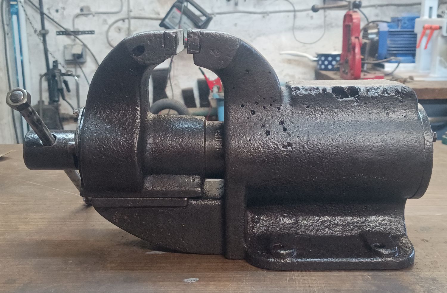 Auf der Suche nach den ultimativen Schraubstock als drehbare Variante nehme ich auf Flohmärkte jeden mit, wenn er mir preislich entgegen kommt. Hier eine Ausführung als Tischschraubstock. Aber auch bei diesem war mir schnell klar, es ist nicht die Größe, die mir für den dauerhaften Gebrauch in der Werkstatt zufrieden stellt. Er ist mir einfach zu klein.