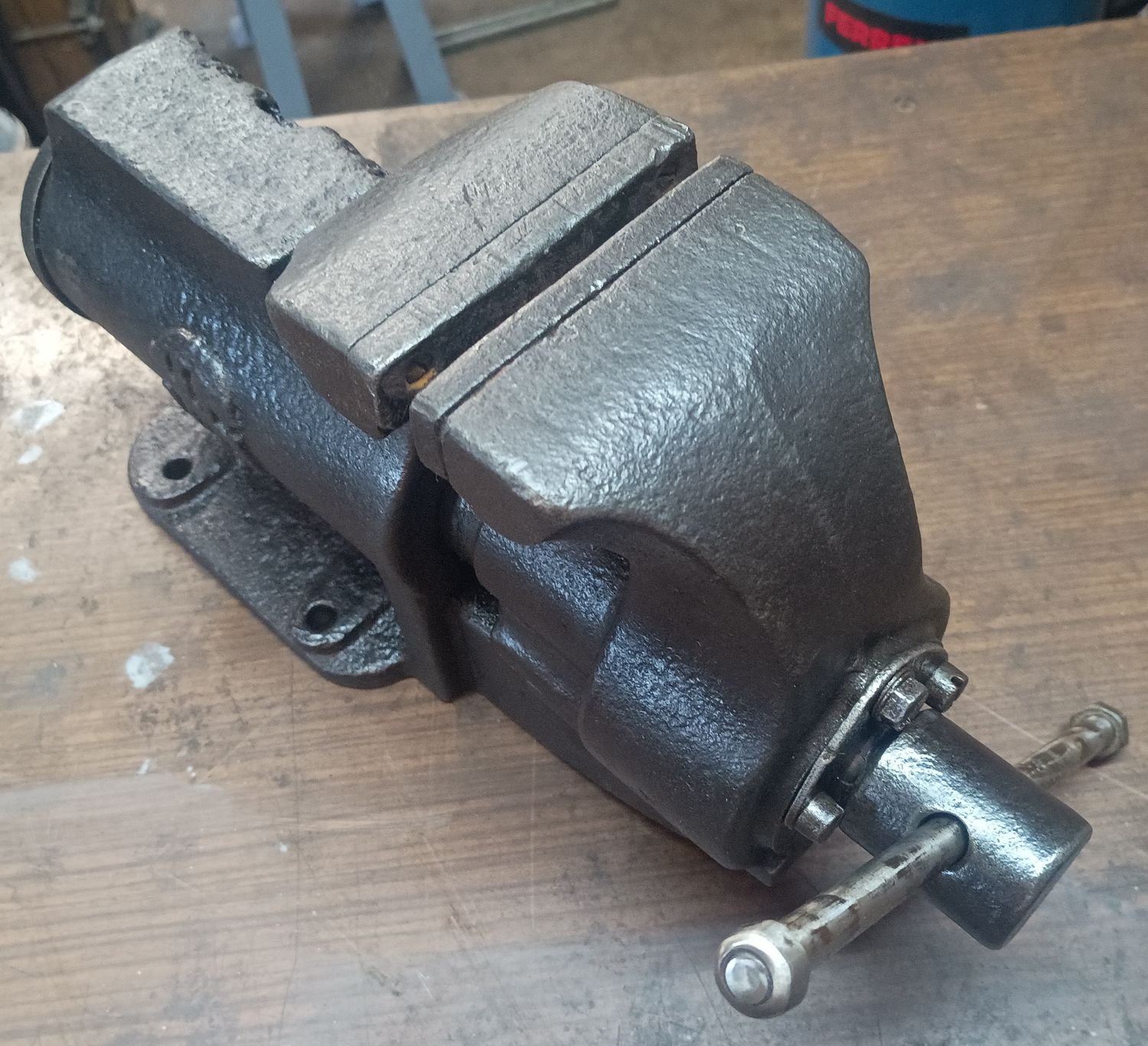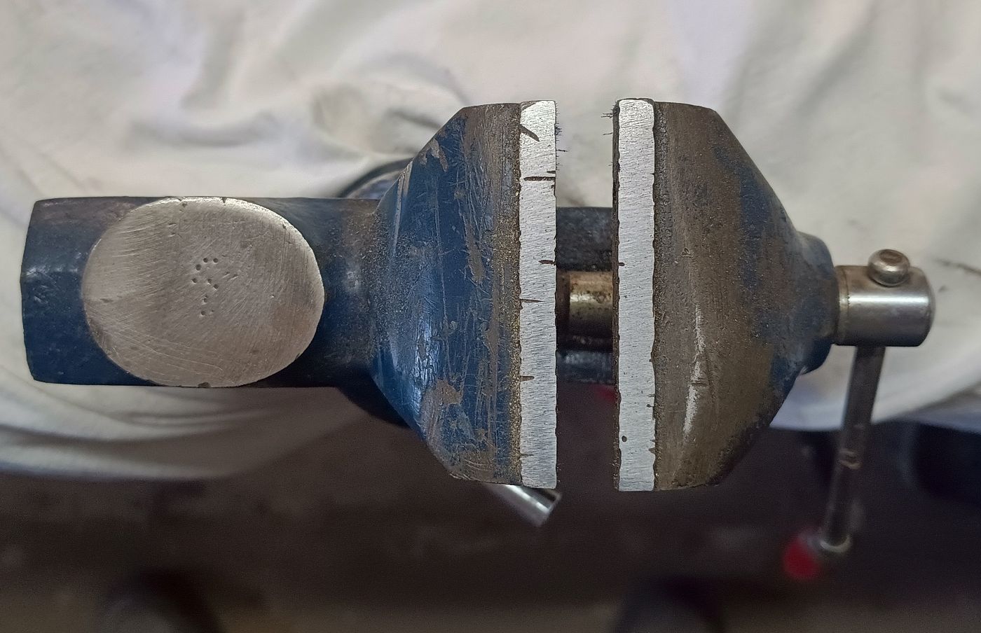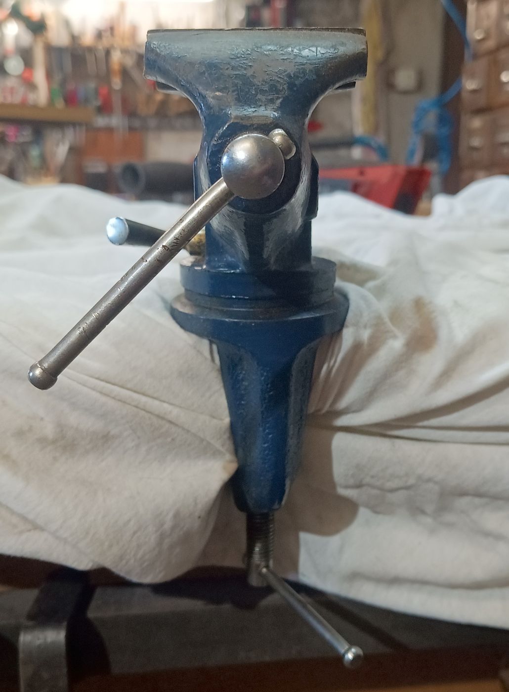 Auf der Suche nach den ultimativen Schraubstock als drehbare Variante nehme ich auf Flohmärkte jeden mit, wenn er mir preislich entgegen kommt. Hier eine Ausführung als Tischschraubstock. Aber auch bei diesem war mir schnell klar, es ist nicht die Größe, die mir für den dauerhaften Gebrauch in der Werkstatt zufrieden stellt. Er ist mir einfach zu klein.