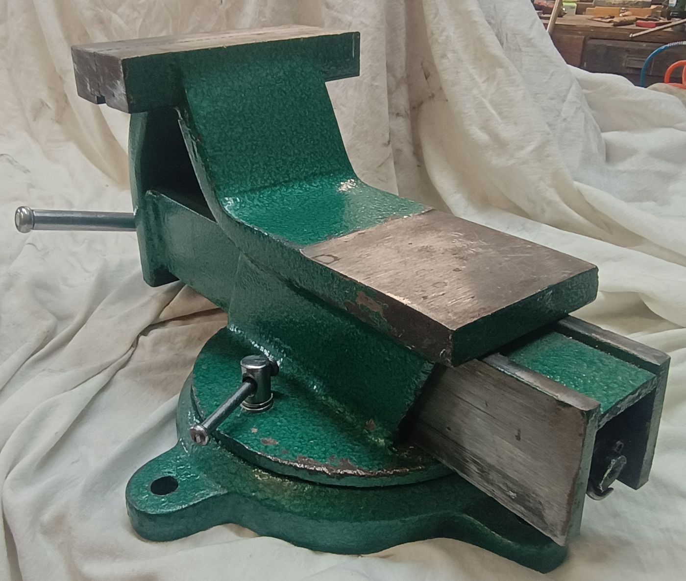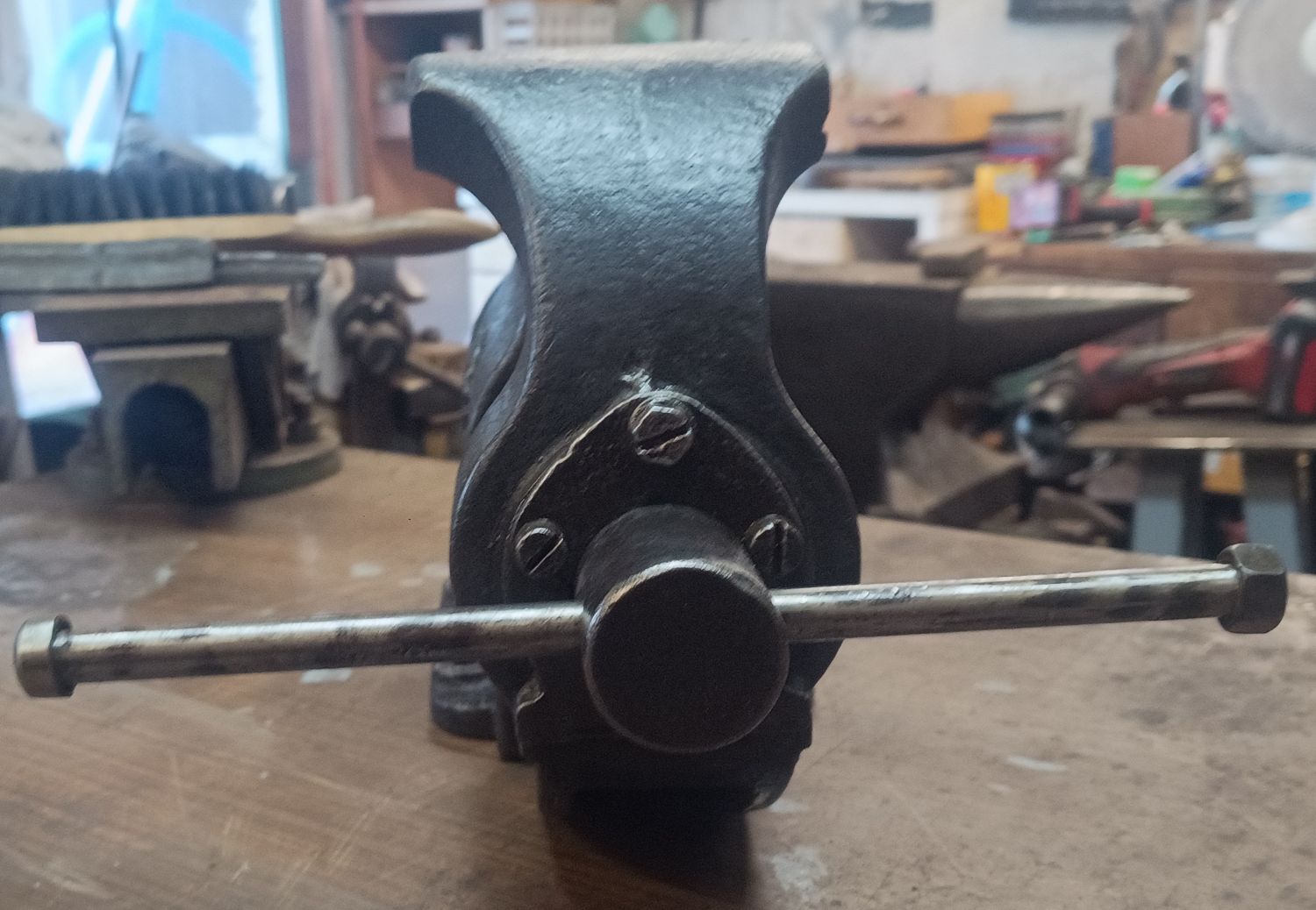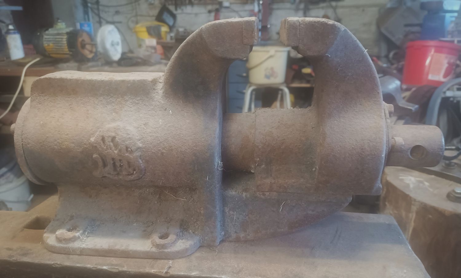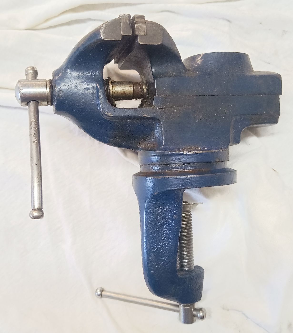 Auf der Suche nach den ultimativen Schraubstock als drehbare Variante nehme ich auf Flohmärkte jeden mit, wenn er mir preislich entgegen kommt. Hier eine Ausführung als Tischschraubstock. Aber auch bei diesem war mir schnell klar, es ist nicht die Größe, die mir für den dauerhaften Gebrauch in der Werkstatt zufrieden stellt. Er ist mir einfach zu klein.