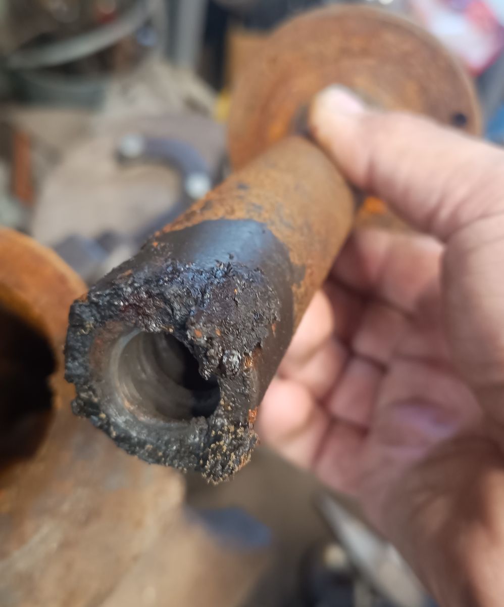Die Qualität des Gusses ist, aus heutiger Sicht jedenfalls, miserabel (miserable? :D ). Er weißt riesige Lunker auf und als ich das Elektrolysewasser aus den kleinen Poren geblasen hatte, spritze die Flüssigkeit auch aus mehreren anderen Löchern heraus. Ähnlich wie bei Holzwurmgänge sind hier die Lunker miteinander verbunden.