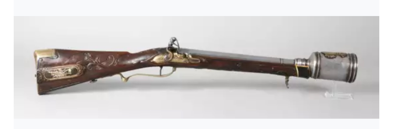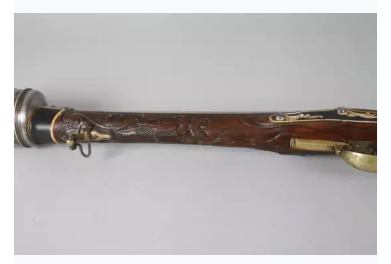 Granatgewehr Anhalt-Bernburg um 1750, in Silberfaden eingelegter Lauf mit der Bezeichnung "MORGENROTH GERNRODE", Schaft (Nussbaumschäftung), Schüber und Vorderschaft mit üppigen Verschneidungen, Ebenholz- und Beineinlagen fein graviert, oktogonaler, zur Büchse hin in rund übergehender Lauf mit balusterförmigem Übergang, auf dem Granataufsatz aufgelegte platzende Granate mit Bernburger Wappen, die komplette Oberseite von Lauf und Aufsatz vegetabil graviert, Steinschloss mit gravierter Schlossplatte in Messing. L ges. ca. 87 cm, Aufsatzteil ca. 12 cm, Lauf gezogen ca. 16 mm, Mündung ca. 65 mm. – Solche höfischen Granatgewehre wurden zum Verschießen von Feuerwerk bei Festlichkeiten verwendet