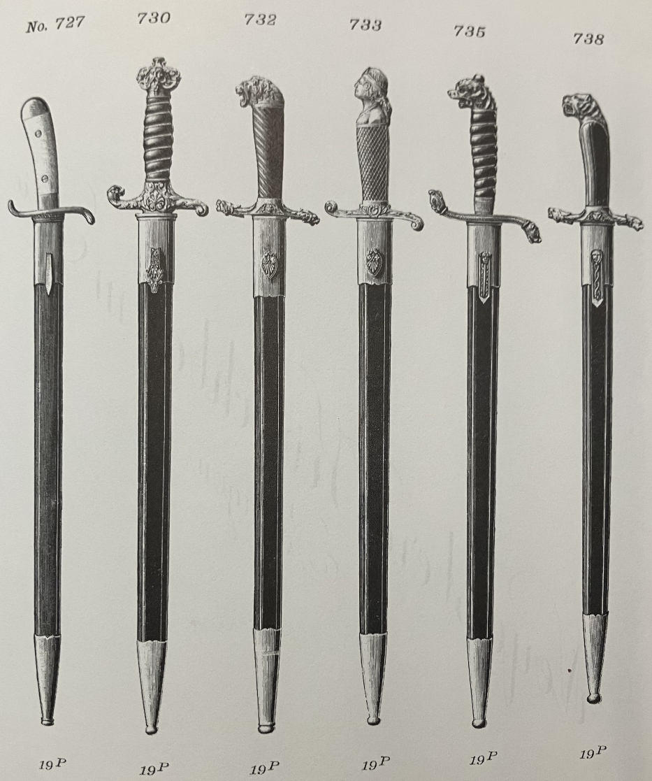 Um 1960 wunderte ich mich noch über einen Dolch mit einem Griffabschluß in Form einer Adlerklaue. Er umspannte eine Kugel, die wohl den Globus darstellen sollte. Dass da noch Steigerungen möglich sind lässt sich heute an den sogen. Fantasy-Dolchen erkennen.