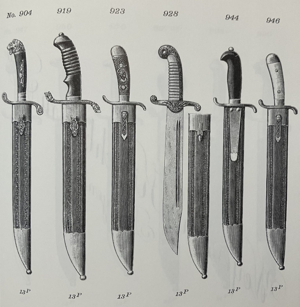 Man darf nicht vergessen, dass in Solingen (und auch anderen Produktionsstädten) alles gefertigt wurde, was der Kunde wollte. So gibt es in einem Weyersberg-Musterbuch-Nachdruck (1892 oder 1893) eine Rubrik "Hauer" mit c.23 Tafeln, auf denen Hauer, Hirschfänger, Bowie-Messer, Macheten und große Messer abgebildet sind, teils mit Klingen, die dieser hier sehr ähneln. Hier einmal eine Tafel, die ich aber tatsächlich ausgewählt habe wegen des Gefäßes.