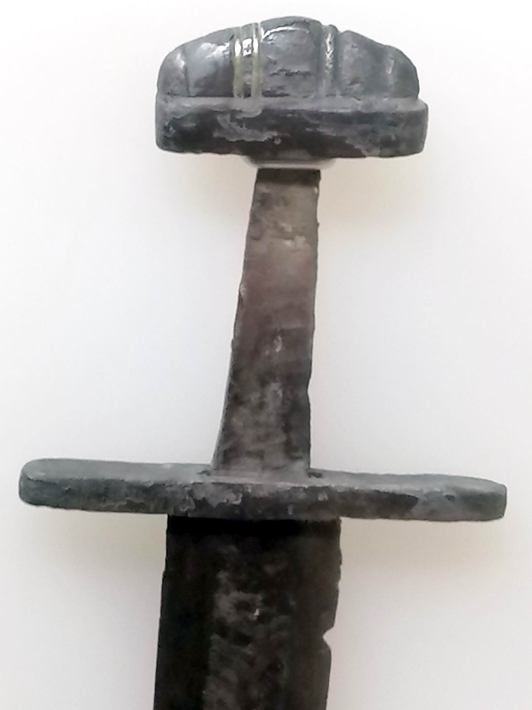 Archäologischen Landesmuseums Brandenburg, hat meines Erachtens eine Damaststahlkinge. Jedenfalls erkennt man farbliche Strukturen. Im Knauf sind in den Vertiefungen zwei der Einlagen erhalten geblieben.
