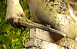 Beschreibung: Abgestufte Wand aus Sandsteinblöcken, die im Mittelteil von zwei Kugeln abgesetzt wird. Das Oberteil mit der Widmung verjüngt sich nach oben und wird von der Figur eines knienden Soldaten mit Stahlhelm und gesenktem Kurzschwert gekrönt.
