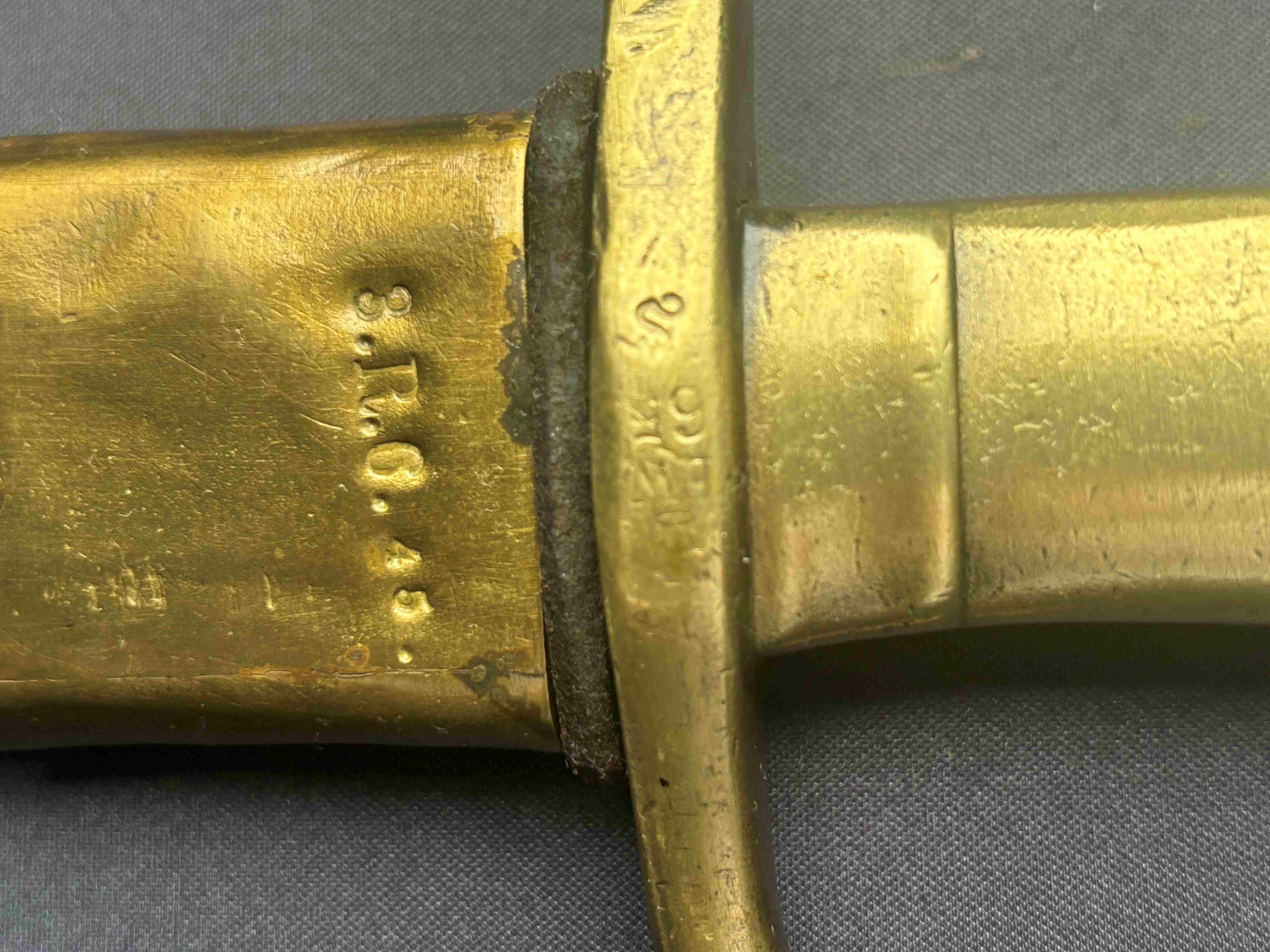 Die Klinge stammt warscheinlich von einem preußischen Jägerhirschfänger M 1857, der hatte keine Säge.