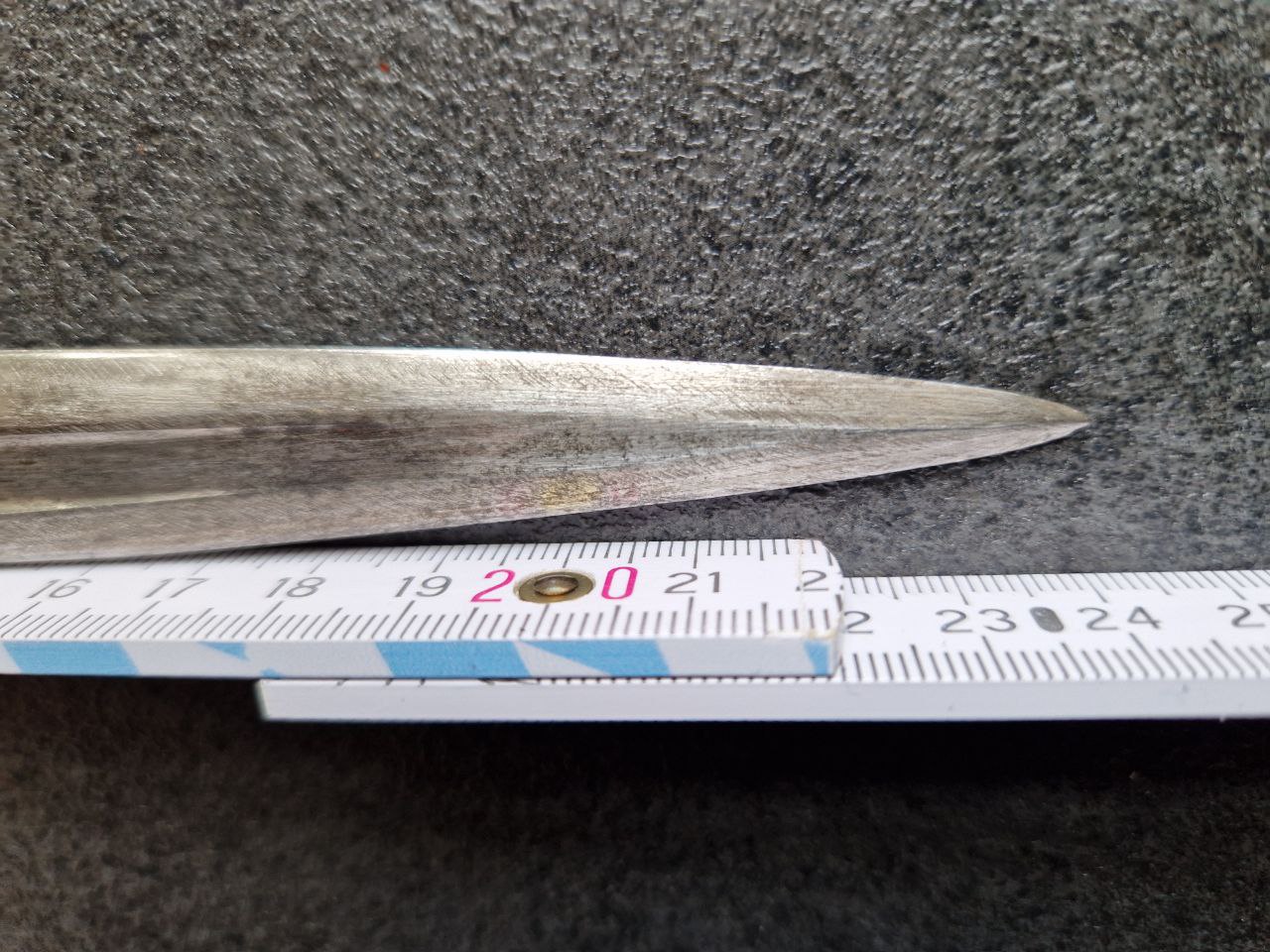 Ich habe jetzt vornehmlich Fotos von dem Stück gesamt und der Spitze eingestellt, da zumindest an der Spitze am Ende kein "Blaupliester" am Werke war - es sieht relativ "grob" geschfliffen aus.