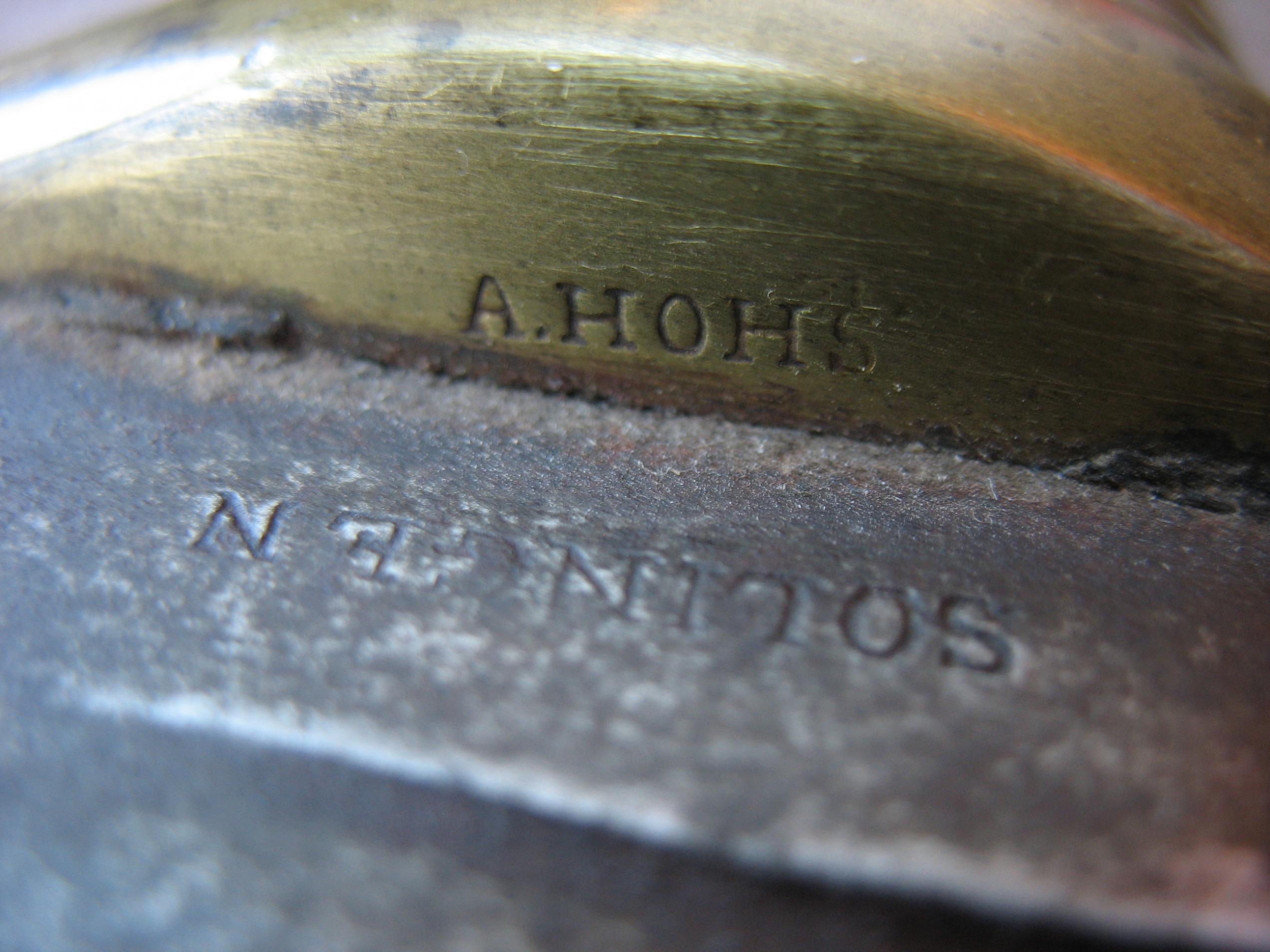 Auf der Griffunterseite finden sich die Angaben „A. Hohs“, von dem ich annehme, dass er der Händler war, es könnte aber auch der Eigentümer der Waffe sein.