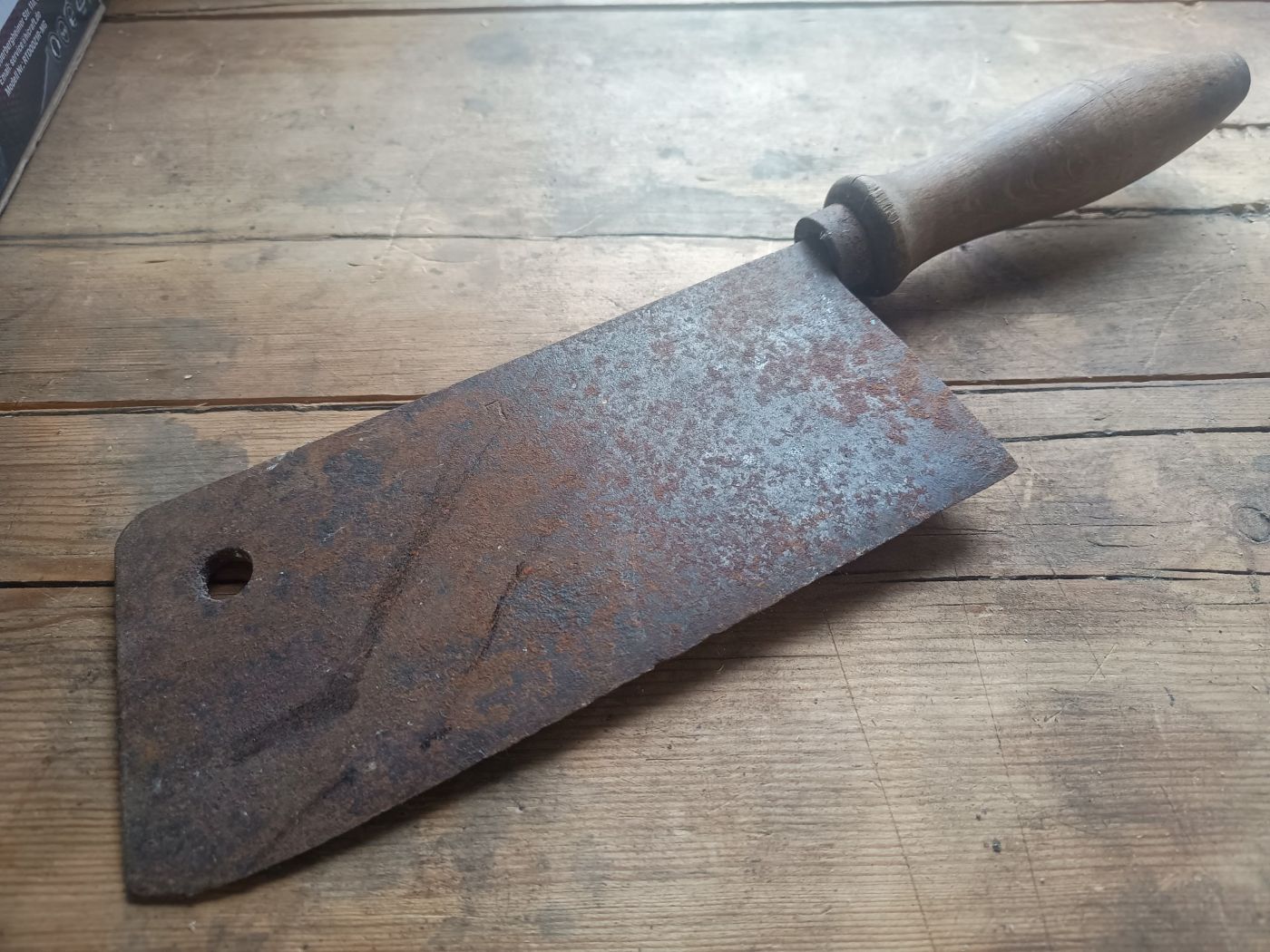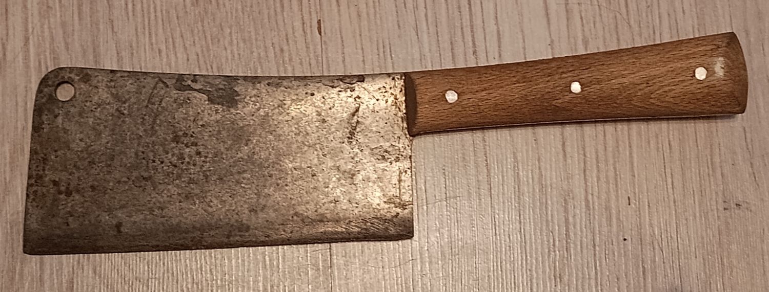 1. Das Küchenbeil aus Familienbesitz. Da mein Opa Kleintierzüchter war, wurde es oft und gerne benutzt, was man an den Nachschärfespuren erkennt. Ich habe es vor wohl 20 Jahren das letzte mal gebraucht, um Hühnerbeine abzuhacken.