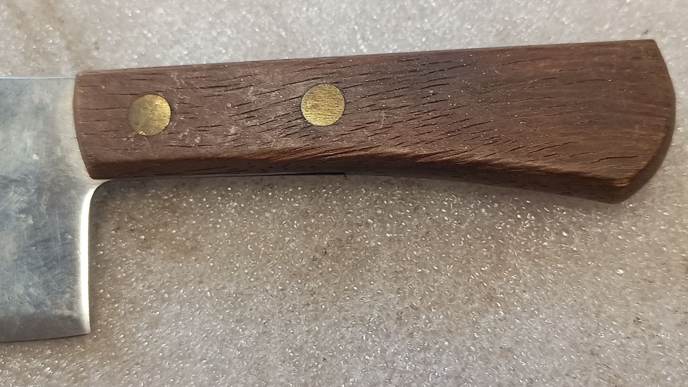1. Das Küchenbeil aus Familienbesitz. Da mein Opa Kleintierzüchter war, wurde es oft und gerne benutzt, was man an den Nachschärfespuren erkennt. Ich habe es vor wohl 20 Jahren das letzte mal gebraucht, um Hühnerbeine abzuhacken.