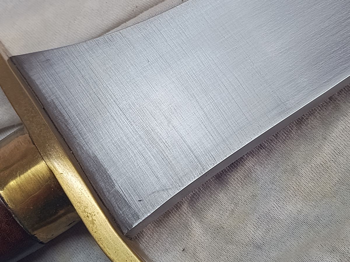 Jetzt wollte er mich dafür belohnen, was ich ausschlug. Aber irgend etwas wollte er mir zukommen lassen, damit ich wieder etwas zum Feilen und Schleifen habe. Ich sollte wählen zwischen Axt, Dolch oder Schwert. Da meinte ich, er möge mich überraschen. So kündigte er ein stark gebrauchtes Schaukampfschwert an, worüber ich mich natürlich sehr freute. Zugleich frug er mich, ob er mir wieder etwas Arbeit in das Paket mit reinpacken darf. Dieses Mal ein Schwert von Purna Darnal aus Kathmandu (Nepal), einem in der Szene hochgeschätzten Klingenschmied. Bei diesem Schwert wurde die Klinge im Fehlschärfenbereich sehr grob und ungleichmäßig geschliffen und ich soll mal versuchen, es einigermaßen glatt zu bekommen.