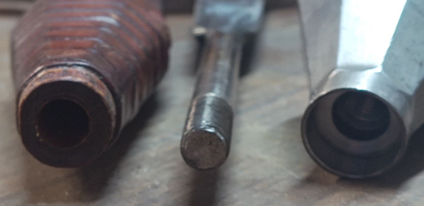 Da es sich um eine Art Sportgerät handelt, werden solche Waffen oft zerlegbar gefertigt, um die Pflege und Wartung zu vereinfachen. Der Aufbau der Angel ist dafür mit einem 10 mm starken Gewinde versehen. Die Schweißverbindung ist hervorragend gearbeitet. Als ehemaliger Schweißer kann ich beurteilen und vermuten, dass die auch großen Beanspruchungen stand hält. Seinerzeit wurde uns beim Schweißerlehrgang beigebracht, dass eine fachgerecht ausgeführte Schweißnaht nie bricht. Wenn, dann immer das Material daneben. Diese Schweißverbindung ist übrigens die Ursache dafür, dass die Parierstange nicht demontiert werden kann. Diese wurde vor der Verschweißung aufgeschoben und geht durch die Verdickung am Rundstahl nun nicht mehr von der Angel.