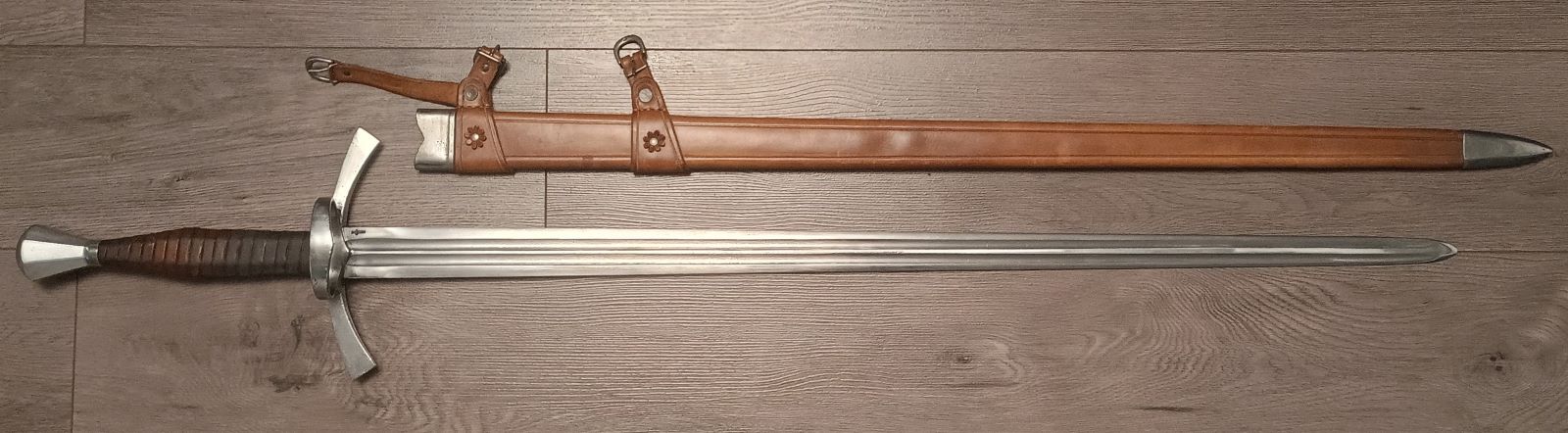 Die Bezeichnung als Schaukampfschwert habe ich in der Überschrift mit einem Fragezeichen versehen. Zwar ist die Klinge nicht scharf, am Ort hingegen aber nicht mehr stumpf genug, um es als Schaukampfschwert verletzungsfrei zu verwenden. Bei mir ist es eh nur Deko. Vielen Dank, Holger, dafür. Es geht als Schwert Nummer 52 in meine Sammmlung ein.