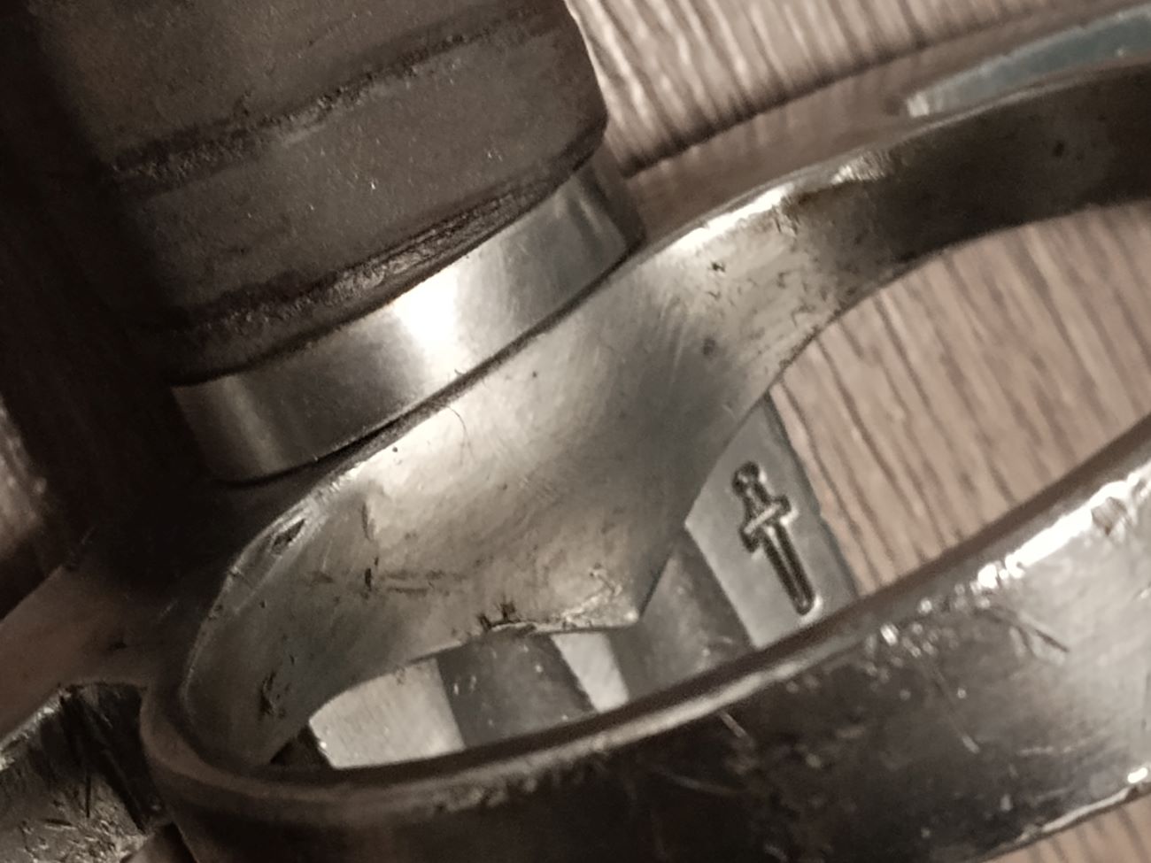 Anfangs habe ich noch überlegt, ob ich ihm auch noch Modifikationen an Parierstange und Hilze angedeihen lasse. Dann habe ich mich aber erstmal mit dem Hersteller beschäftigt. LUTEL war eine tschechische Schmiede, die bis ca. Ende 2019 sehr gute Blankwaffen herstellte. Und weil das in der Vergangenheit liegt, habe ich jedwede Manipulation verworfen, lediglich die Kampfspuren etwas "entschärft", alle Metallteile leicht überpoliert und geölt.