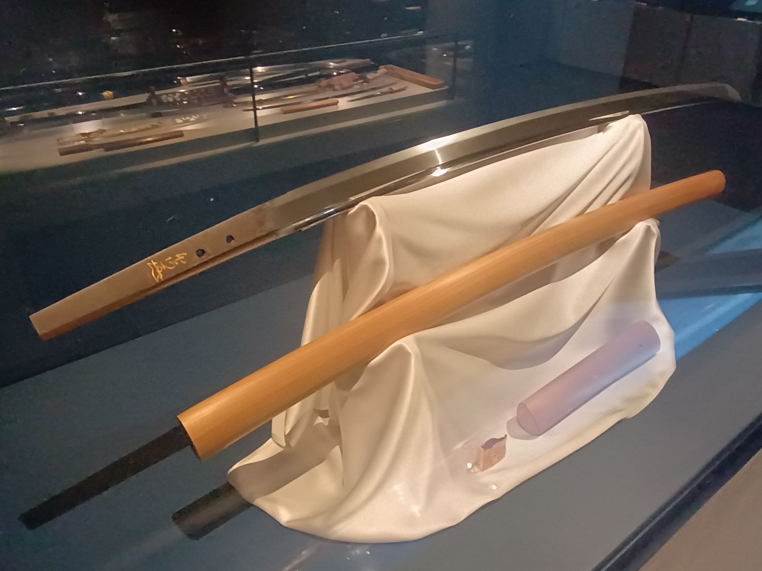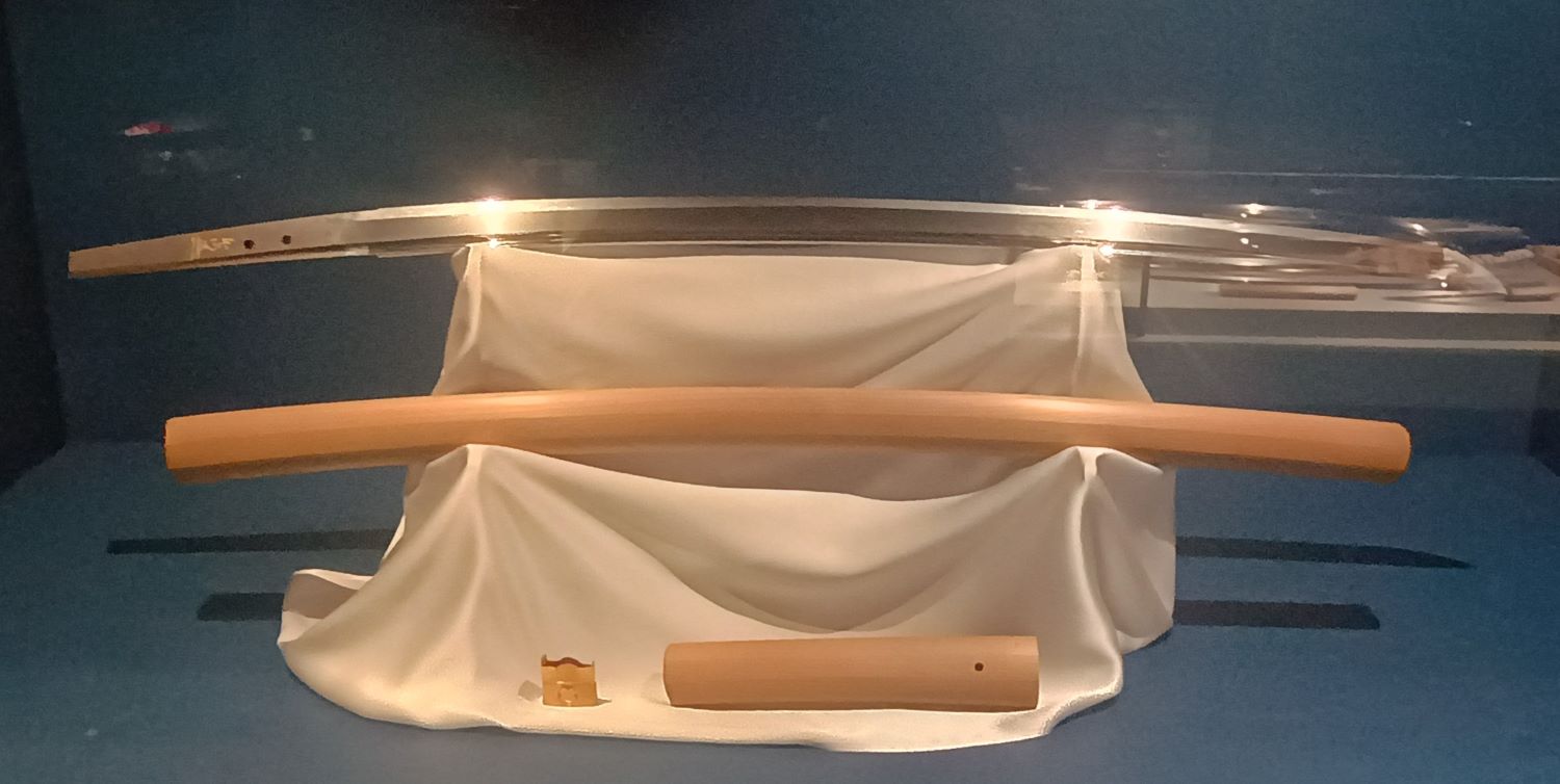 Diese nicht näher beschriebene, relativ junge und wunderschöne Klinge, ist mir beim Besuch des Samurai Museum Berlin aufgefallen. Nicht näher beschrieben bedeutet nicht, dass sie in der Vitrine nicht doch irgendwo deklariert wurde, aber unter meinen Fotos findet sich diesbezüglich nichts. Wohl aber zu der goldenen Signatur auf der Angel. Diese stammt von einem aus der Hon’ami-Linie stammenden Ansprechpartner für die Bewertung von japanischer Klingen. Ich könnte zu diesem Thema etwas zusammen stammeln, wobei ich nur eines garantieren könnte, und zwar, die Sachverhalte durcheinander zu bringen.