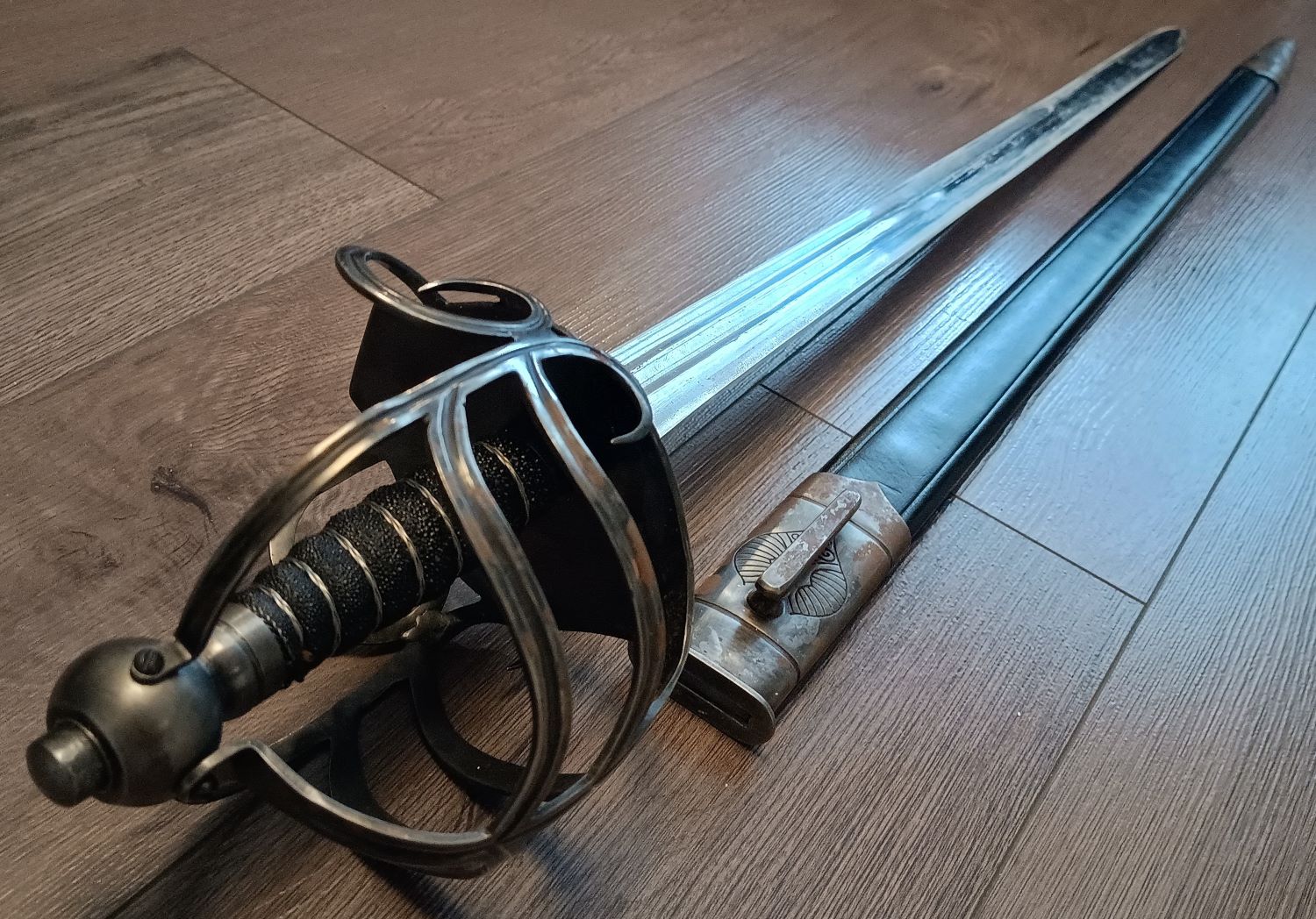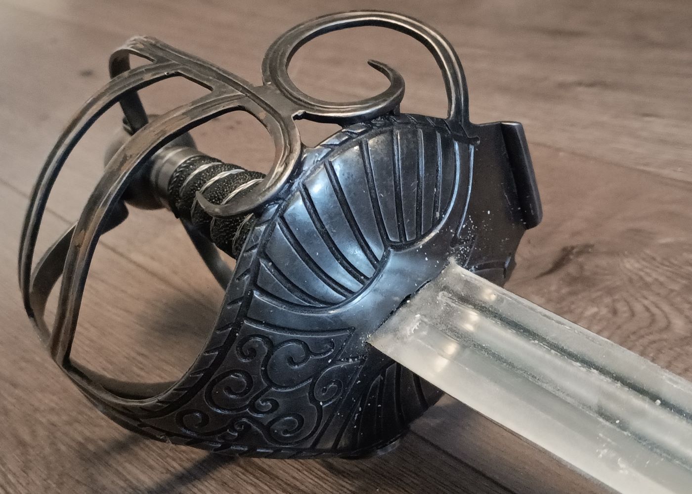 Es handelt sich um die Interpretation eines englischen Mortuary Sword mit Korbgriff aus dem 17. Jahrhundert.