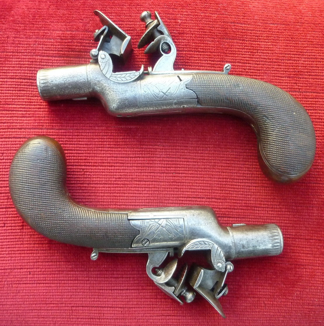 In dieser Form sind solche Pistolen wohl nicht so häufig, besonders als Paar. Ein weiteres schönes Beispiel für die zum Teil sehr ausgefallenen Designs unserer Freunde von den britischen Inseln!