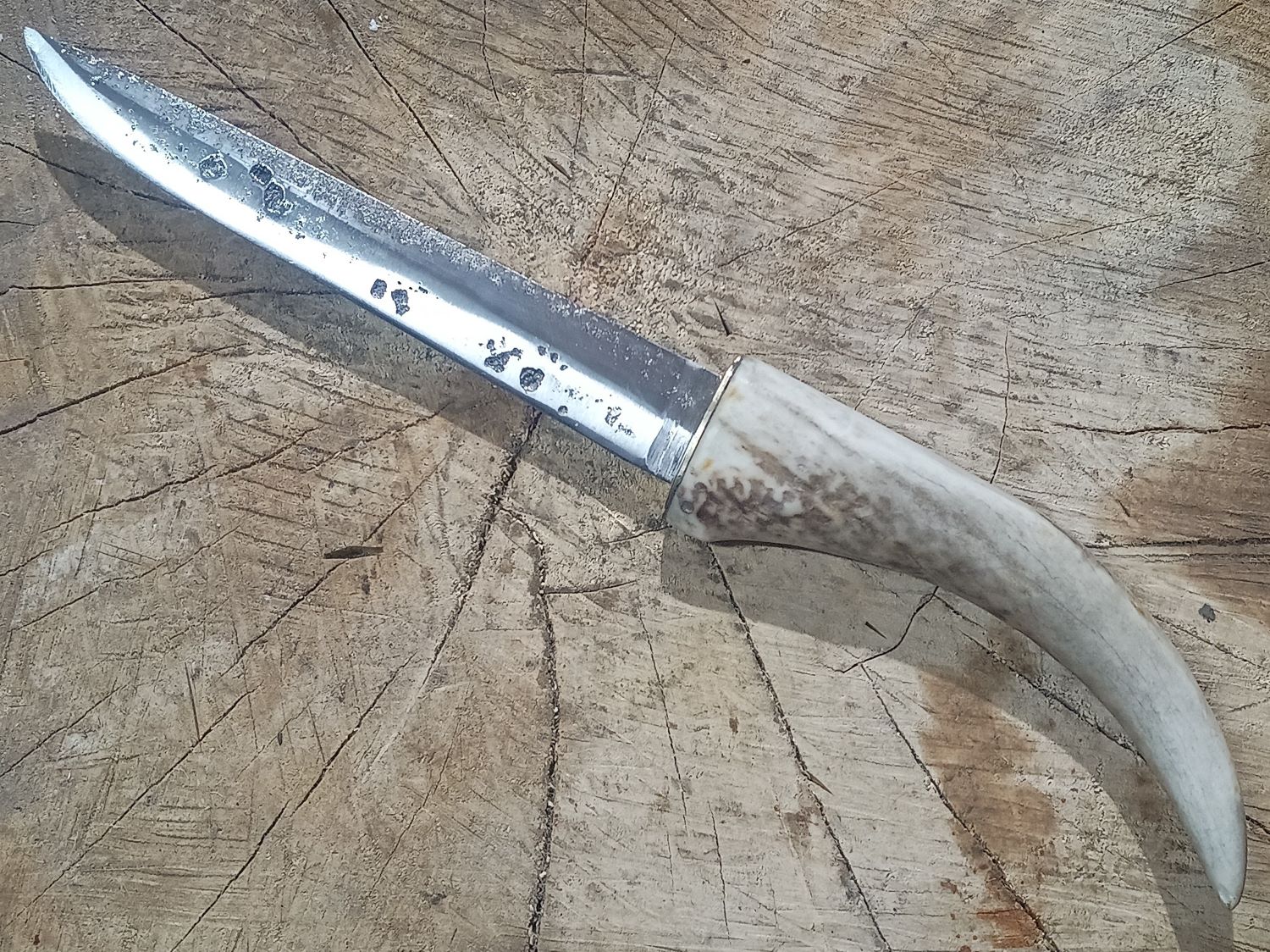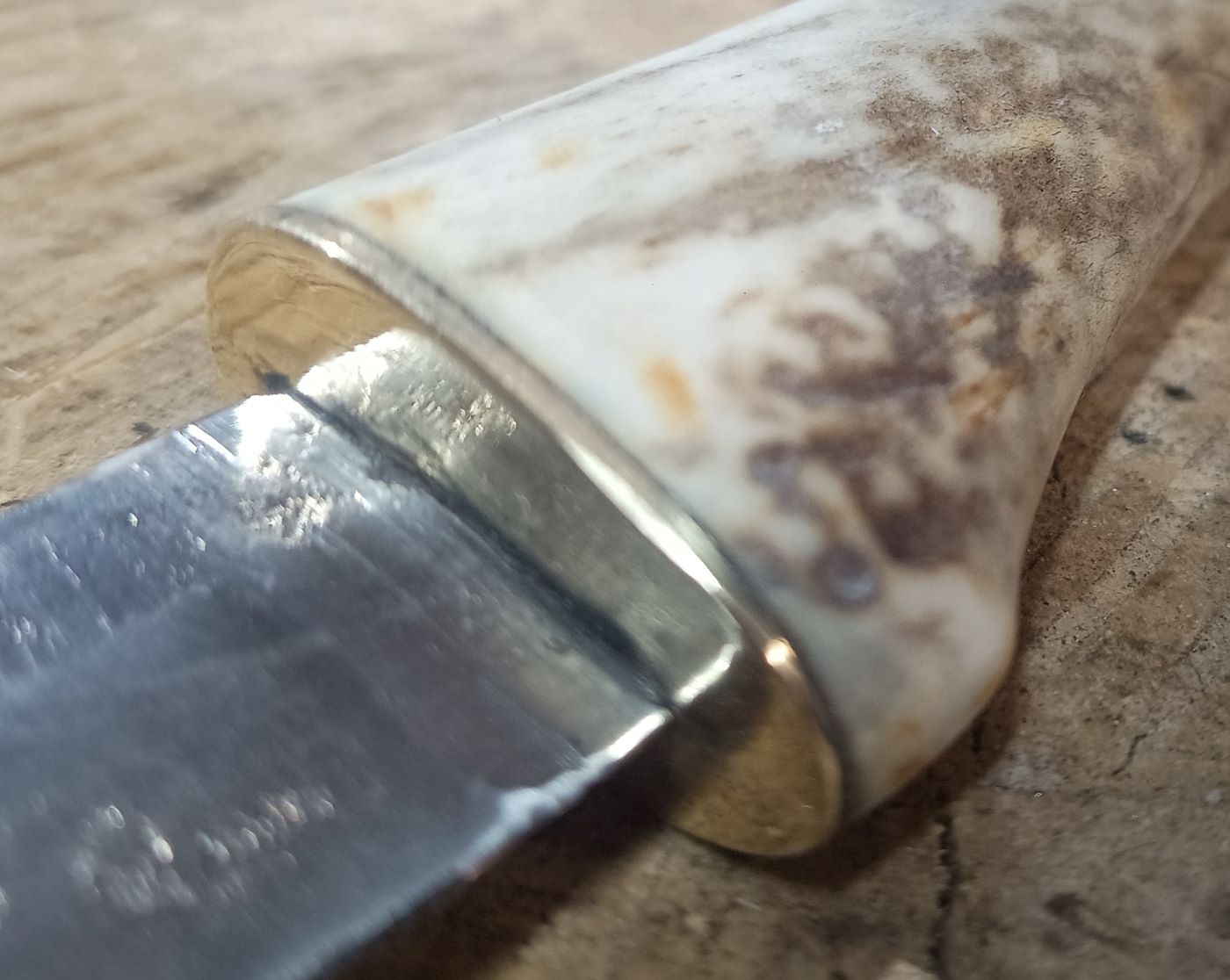 Aufgrund der nachträglichen Vernickelung der Klinge durch einen Vorbesitzer, werden die Narben so schnell nicht mehr rosten. Die Messingplatte war ursprünglich ein etwa 40 Jahre alter Blinker (Angelköder). Das letzte Foto zeigt den Urzustand.
